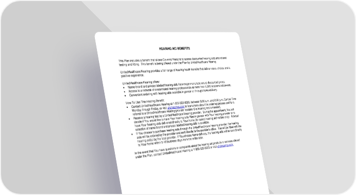 HEARING AID BENEFITS This Plan includes a benefit that allows Covered Persons to access discounted hearing aids and related testing and fitting. This benefit is being offered under the Plan by UnitedHealthcare Hearing. UnitedHealthcare Hearing provides a full range of hearing health benefits that deliver value, choice, and a positive experience. UnitedHealthcare Hearing offers: • Name-brand and private-labeled hearing aids from major manufacturers at discounted prices. • Access to a network of credentialed hearing professionals at more than 5,000 locations nationwide. • Convenient ordering with hearing aids available in person or through home delivery. How To Use This Hearing Benefit: • Contact UnitedHealthcare Hearing at 1-855-523-9355, between 8:00 a.m. and 8:00 p.m. Central Time Monday through Friday, or visit uhchearing.com to learn more about the ordering process and for a referral to a UnitedHealthcare Hearing provider location (if a hearing test is needed). • Receive a hearing test by a UnitedHealthcare Hearing provider. During the appointment, You will decide if You would like to have Your hearing aids fitted in person with Your hearing provider or to have Your hearing aids delivered directly to Your home (for select hearing aid models only). A broad selection of name-brand and private-labeled hearing aids is available. • If You choose to purchase hearing aids through the UnitedHealthcare Hearing provider, the hearing aids will be ordered by the provider and sent directly to the provider’s office. You will be fitted with the hearing aid(s) by the local provider. If You choose home delivery, the hearing aids will be sent directly to Your home within 5-10 business days from the order date. In the event that You have questions or complaints about the hearing aid products or services offered under the Plan, contact UnitedHealthcare Hearing at 1-855-523-9355 or visit uhchearing.com. -76- 7670-00-413597