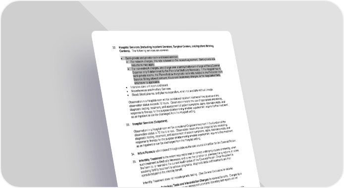 32. Hospital Services (Including Inpatient Services, Surgical Centers, and Inpatient Birthing Centers). The following services are covered: • Semi-private and private room and board services: ➢ For network charges, this rate is based on the network agreement. Semi-private rate reductions may apply. ➢ For non-network charges, any charge over a semi-private room charge will be a Covered Expense only if determined by the Plan to be Medically Necessary. If the Hospital has no semi-private rooms, the Plan will allow the private room rate, subject to the Protection from Balance Billing allowed amount, Usual and Customary charges, or the Negotiated Rate, whichever is applicable. • Intensive care unit room and board. • Miscellaneous and Ancillary Services. • Blood, blood plasma, and plasma expanders, when not available without charge. Observation in a Hospital room will be considered Inpatient treatment if the duration of the observation status exceeds 72 hours. Observation means the use of appropriate monitoring, diagnostic testing, treatment, and assessment of patient symptoms, signs, laboratory tests, and response to therapy for the purpose of determining whether a patient will require further treatment as an Inpatient or can be discharged from the Hospital setting. 33. Hospital Services (Outpatient). Observation in a Hospital room will be considered Outpatient treatment if the duration of the observation status is 72 hours or less. Observation means the use of appropriate monitoring, diagnostic testing, treatment, and assessment of patient symptoms, signs, laboratory tests, and response to therapy for the purpose of determining whether a patient will require further treatment as an Inpatient or can be discharged from the Hospital setting. 34. Infant Formula administered through a tube as the sole source of nutrition for the Covered Person. 35. Infertility Treatment to the extent required to treat or correct underlying causes of infertility, when such treatment is Medically Necessary and cures the condition of, alleviates the symptoms of, slows the harm to, or maintains the current health status of the Covered Person. Once the patient is receiving fertility treatment to achieve pregnancy, diagnostic tests and treatments are then considered part of the infertility benefit. Infertility Treatment does not include genetic testing. (See General Exclusions for details). 36. Laboratory or Pathology Tests and Interpretation Charges for covered benefits. Charges by a pathologist for interpretation of computer-generated automated laboratory test reports are not covered by the Plan. 37. Manipulations: Treatments for musculoskeletal conditions when Medically Necessary. Also refer to Maintenance Therapy under the General Exclusions section of this SPD. 38. Maternity Benefits for Covered Persons include: • Hospital or Birthing Center room and board. • Vaginal delivery or Cesarean section. • Non-routine prenatal care. • Postnatal care. • Diagnostic testing. • Abdominal operation for intrauterine pregnancy or miscarriage. • Outpatient Birthing Centers. • Midwives. 39. Medical and/or Routine Services Provided in a Foreign Country, except that no coverage is provided if the sole purpose of travel to that country is to obtain medical services and/or supplies. -62- 7670-00-413597
