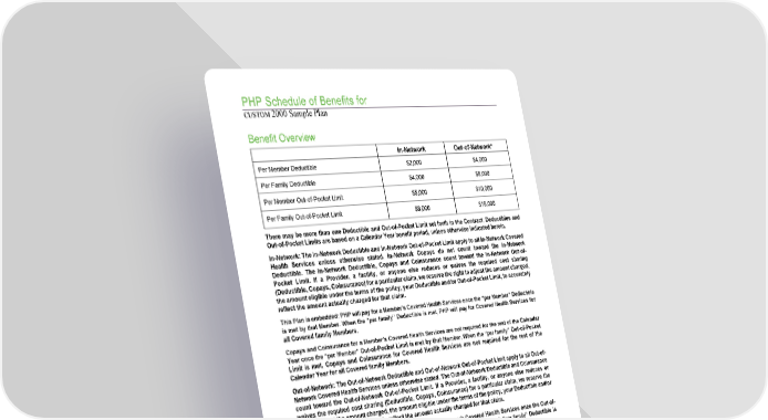 PHP Schedule of Benefits for CUSTOM 2000 Sample Plan Benefit Overview In-Network Out-of-Network* Per Member Deductible $2,000 $4,000 Per Family Deductible $4,000 $8,000 Per Member Out-of-Pocket Limit $5,000 $10,000 Per Family Out-of-Pocket Limit $8,000 $16,000 There may be more than one Deductible and Out-of-Pocket Limit set forth in the Contract. Deductibles and Out-of-Pocket Limits are based on a Calendar Year benefit period, unless otherwise indicated herein. In-Network: The In-Network Deductible and In-Network Out-of-Pocket Limit apply to all In-Network Covered Health Services unless otherwise stated. In-Network Copays do not count toward the In-Network Deductible. The In-Network Deductible, Copays and Coinsurance count toward the In-Network Out-of- Pocket Limit. If a Provider, a facility, or anyone else reduces or waives the required cost sharing (Deductible, Copays, Coinsurance) for a particular claim, we reserve the right to adjust the amount charged, the amount eligible under the terms of the policy, your Deductible and/or Out-of-Pocket Limit, to accurately reflect the amount actually charged for that claim. This Plan is embedded: PHP will pay for a Member’s Covered Health Services once the “per Member” Deductible is met by that Member. When the “per family” Deductible is met, PHP will pay for Covered Health Services for all Covered family Members. Copays and Coinsurance for a Member’s Covered Health Services are not required for the rest of the Calendar Year once the “per Member” Out-of-Pocket Limit is met by that Member. When the “per family” Out-of-Pocket Limit is met, Copays and Coinsurance for Covered Health Services are not required for the rest of the Calendar Year for all Covered family Members. Out-of-Network: The Out-of-Network Deductible and Out-of-Network Out-of-Pocket Limit apply to all Out-of- Network Covered Health Services unless otherwise stated. The Out-of-Network Deductible and Coinsurance count toward the Out-of-Network Out-of-Pocket Limit. If a Provider, a facility, or anyone else reduces or waives the required cost sharing (Deductible, Copays, Coinsurance) for a particular claim, we reserve the right to adjust the amount charged, the amount eligible under the terms of the policy, your Deductible and/or Out-of-Pocket Limit, to accurately reflect the amount actually charged for that claim. This Plan is embedded: PHP will pay for a Member’s Out-of-Network Covered Health Services once the Out-of- Network “per Member” Deductible is met by that Member. When the Out-of-Network “per family” Deductible is met, PHP will pay for Out-of-Network Covered Health Services for all Covered family Members. Coinsurance for a Member’s Out-of-Network Covered Health Services is not required for the rest of the Calendar Year once the Out-of-Network “per Member” Total Out-of-Pocket Limit is met by that Member. When the Out-of-Network “per family” Total Out-of-Pocket Limit is met, Coinsurance for Out-of-Network Covered Health Services is not required for the rest of the Calendar Year for all Covered family Members. Expenses you incur on non-Covered Services do not count toward the applicable In-Network or Out-of- Network Deductible or toward the applicable In-Network or Out-of-Network Out-of-Pocket Limit. This schedule is a summary of the benefits available to you. It also may help you understand how much you may have to pay for a particular service. Before getting any Health Services, you should review your Certificate of Coverage and contact us to check your Coverage. PHP.POS.LG.NGF.SOBTRAD.JSC.01-PUBLISHED 2024 P_240082_L 09.09.2024