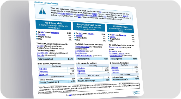 Page 7 of 7 P_250018_L The plan would be responsible for the other costs of these EXAMPLE covered services. Peg is Having a Baby (9 months of in-network pre-natal care and a hospital delivery) Mia’s Simple Fracture (in-network emergency room visit and follow up care) Managing Joe’s Type 2 Diabetes (a year of routine in-network care of a well- controlled condition) ◼ The plan’s overall deductible $2000 ◼ Specialist 20% ◼ Hospital (facility) 20% ◼ Other 20% This EXAMPLE event includes services like: Specialist office visits (prenatal care) Childbirth/Delivery Professional Services Childbirth/Facility Services Diagnostic tests (ultrasounds and blood work) Specialist visit (anesthesia) Total Example Cost $12,700 In this example, Peg would pay: Cost Sharing Deductibles $2000 Copayments $10 Coinsurance $2100 What isn’t covered Limits or exclusions $60 The total Peg would pay is $4170 ◼ The plan’s overall deductible $2000 ◼ Specialist 20% ◼ Hospital (facility) 20% ◼ Other 20% This EXAMPLE event includes services like: Primary care physician office visits (including disease education) Diagnostic tests (blood work) Prescription drugs Durable medical equipment (glucose meter) Total Example Cost $5,600 In this example, Joe would pay: Cost Sharing Deductibles $1200 Copayments $1000 Coinsurance $0 What isn’t covered Limits or exclusions $0 The total Joe would pay is $2200 ◼ The plan’s overall deductible $2000 ◼ Specialist 20% ◼ Hospital (facility) 20% ◼ Other 20% This EXAMPLE event includes services like: Emergency room care (including medical supplies) Diagnostic test (x-ray) Durable medical equipment (crutches) Rehabilitation services (physical therapy) Total Example Cost $2,800 In this example, Mia would pay: Cost Sharing Deductibles $2000 Copayments $10 Coinsurance $200 What isn’t covered Limits or exclusions $0 The total Mia would pay is $2210 Note: These numbers assume the patient is not participating in an employer-sponsored Health Reimbursement Arrangement (HRA). Your employer may or may not sponsor an HRA. If you participate in an HRA, your costs may be lower than the costs in these coverage examples. For information, including whether your employer sponsors an HRA, please contact your plan administrator. About these Coverage Examples: This is not a cost estimator. Treatments shown are just examples of how this plan might cover medical care. Your actual costs will be different depending on the actual care you receive, the prices your providers charge, and many other factors. Focus on the cost sharing amounts (deductibles, copayments and coinsurance) and excluded services under the plan. Use this information to compare the portion of costs you might pay under different health plans. Please note these coverage examples are based on self-only coverage.