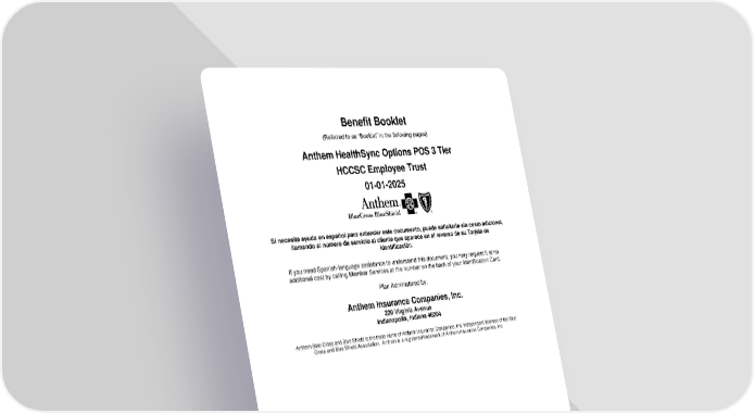 ABCBS - LG ASO POS v0 8 8X5W Benefit Booklet (Referred to as Booklet in the following pages) Anthem HealthSync Options POS 3 Tier HCCSC Employee Trust 01 - 01 - 2025 Si necesita ayuda en espaol para entender este documento, puede solicitarla sin costo adicional, llamando al nmero de servicio al cliente que aparece en el reverso de su Tarjeta de Identificacin. If you need Spanish - language assistance to understand this document, you may request it at no additional cost by calling Member Services at the number on the back of your Identification Card. Plan Administered by: Anthem Insurance Companies, Inc. 220 Virginia Avenue Indianapolis, Indiana 46204 Anthem Blue Cross and Blue Shield is the trade name of Anthem Insurance Companies, Inc. Independent licensee of the Blue Cross and Blue Shield Association. A nthem is a registered trademark of Anthem Insurance Companies, Inc.