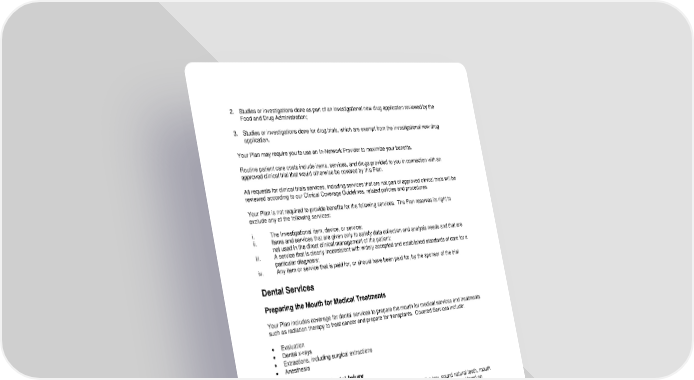 45 2. Studies or investigations done as part of an investigational new drug application reviewed by the Food and Drug Administration; 3. Studies or investigations done for drug trials, which are exempt from the investigational new drug application. Your Plan may require you to use an In - Network Provider to maximize your benefits. Routine patient care costs include items, services, and drugs provided to you in connection with an approved clinical trial that would otherwise be covered by this Plan. All requests for clinical trials services, including services that are not part of approved clinical trials will be reviewed according to our Clinical Coverage Guidelines, related policies and procedures. Your Plan is not required to provide benefits for the following services. The Plan reserves its right to exclude any of the following services: i. The Investigational item, device, or service; ii. Items and services that are given only to satisfy data collection and analysis needs and that are not used in the direct clinical management of the patient; iii. A service that is clearly inconsistent with widely accepted and established standards of care for a particular diagnosis; iv. Any item or service that is paid for, or should have been paid for, by the sponsor of the trial Dental Services Preparing the Mouth for Medical Treatments Your Plan includes coverage for dental services to prepare the mouth for medical services and treatments such as radiation therapy to treat cancer and prepare for transplants. Covered Services include: Evaluation Dental x - rays Extractions, including surgical extractions Anesthesia Treatment of Accidental Injury Benefits are also available for dental work needed to treat injuries to the jaw, sound natural teeth, mouth or face as a result of an accident. An injury that results from chewing or biting is not considered an Accidental Injury under this Plan, unless th e chewing or biting results from a medical or mental condition. Anesthesia and Hospital Charges for Dental Care Your Plan covers anesthesia and Hospital charges for dental care, for a Member less than 19 years of age or a Member who is physically or mentally disabled, if the Member requires dental treatment to be given in a Hospital or Outpatient Ambulatory Surg ery Center . The Indications for General Anesthesia, as published in the reference manual of the American Academy of Pediatric Dentistry, should be used to determine whether performing dental procedures is necessary to treat the Members condition under genera l anesthesia. This coverage does not apply to treatment for temporal mandibular joint disorders (TMJ).