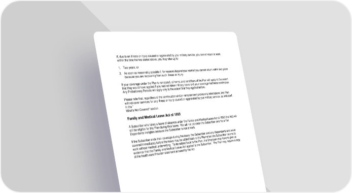 104 If, due to an illness or injury caused or aggravated by your military service, you cannot return to work within the time frames stated above, you may take up to: 1. Two years; or 2. As soon as reasonably possible if, for reasons beyond your control you cannot return within two years because you are recovering from such illness or injury. If your coverage under the Plan is reinstated, all terms and conditions of the Plan will apply to the extent that they would have applied if you had not taken military leave and your coverage had been continuous. Any Probationary Periods will apply only t o the extent that they applied before. Please note that, regardless of the continuation and/or reinstatement provisions listed above, this Plan will not cover services for any illness or injury caused or aggravated by your military service, as indicated in the " Whats Not Covered " section. Family and Medical Leave Act of 1993 A Subscriber who takes a leave of absence under the Family and Medical Leave Act of 1993 (the Act) will still be eligible for this Plan during their leave. We will not consider the Subscriber and his or her Dependents ineligible because the Subscriber is not at work. If the Subscriber ends their coverage during the leave, the Subscriber and any Dependents who were covered immediately before the leave may be added back to the Plan when the Subscriber returns to work without medical underwriting. To be added back to the Plan, the Employer may have to give us evidence that the Family and Medical Leave Act applied to the Subscriber. The Plan may require a copy of the health care Provider statement allowed by the Act.