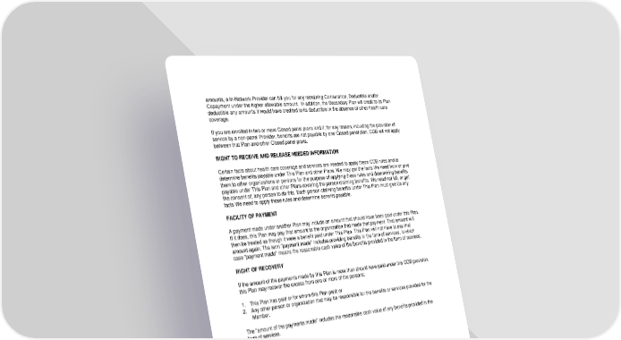 85 amounts, a In - Network Provider can bill you for any remaining Coinsurance, Deductible and/or Copayment under the higher allowable amount. In addition, the Secondary Plan will credit to its Plan deductible any amounts it would have credited to its deductible in the absence of other health care coverage. If you are enrolled in two or more Closed panel plans and if, for any reason, including the provision of service by a non - panel Provider, benefits are not payable by one Closed panel plan, COB will not apply between that Plan and other Closed panel plans . RIGHT TO RECEIVE AND RELEASE NEEDED INFORMATION Certain facts about health care coverage and services are needed to apply these COB rules and to determine benefits payable under This Plan and other Plans . We may get the facts We need from or give them to other organizations or persons for the purpose of applying these rules and determining benefits payable under This Plan and other Plans covering the person claiming benefits. We need not tell, or get the consent of, any person to do this. Each person claiming benefits under This Plan must give Us any fac ts We need to apply those rules and determine benefits payable. FACILITY OF PAYMENT A payment made under another Plan may include an amount that should have been paid under this Plan . If it does, this Plan may pay that amount to the organization that made that payment. That amount will then be treated as though it were a benefit paid under This Plan . This Plan will not have to pay that amount again. The term "payment made" includes providing benefits in the form of services, in which case "payment made" means the reasonable cash value of the benefits provided in the form of services. RIGHT OF RECOVERY If the amount of the payments made by this Plan is more than should have paid under this COB provision, this Plan may recover the excess from one or more of the persons: 1. This Plan has paid or for whom this Plan paid; or 2. Any other person or organization that may be responsible for the benefits or services provided for the Member. The "amount of the payments made" includes the reasonable cash value of any benefits provided in the form of services.