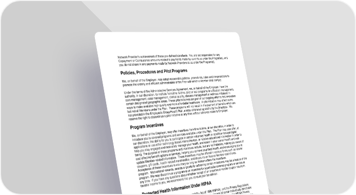 108 Network Providers achievement of these pre - defined standard s. You are not responsible for any Copayment or Coinsurance amounts related to payments made by us or to us under the Program(s), and you do not share in any payments made by Network Providers to us under the Program(s). Policies, Procedures and Pilot Programs We, on behalf of the Employer, may adopt reasonable policies, procedures, rules and interpretations to promote the orderly and efficient administration of the Plan with which a Member shall comply. Under the terms of the Administrative Services Agreement, we, on behalf of the Employer, have the authority, in our discretion, to institute from time to time, pilot or test programs for utilization management, care management, case management, clinical quality , disease management or wellness initiatives in certain designated geographic areas. These pilot initiatives are part of our ongoing effort to find innovative ways to make available high quality and more affordable healthcare. A pilot initiative may affect some, but not all Members under the Plan. These programs will not result in the payment of benefits which are not provided in the Employer's Group Health Plan, unless otherwise agreed to by the Employer. We reserve the right to discontinue a pilot initiative at any time without advance notice to Employer. Program Incentives We , on behalf of the Employer, may offer incentives from time to time, at our discretion, in order to introduce you to covered programs and services available under this Plan. The Plan may also offer, at our discretion, the ability for you to participate in certain voluntary health or condition - focused digital applications or use other technology based interactive tool, or receive educational information in order to help you stay engage d and motivated, manage your health, and assist in your overall health and well - being. The purpose of these programs and incentives include, but are not limited to, making you aware of cost effective benefit options or services, helping you achieve your best health, and encouraging you to update Member - related information. These incentives may be offered in various forms such as retailer coupons, gift cards, health related merchandise, and discounts on fees or Member cost shares. Acceptance of these incentives is voluntary as long as Anthem offers the incentives program. Motivational rewards, awards or points for achieving certain milestones may be a feature of the program. We may discontinue a program or an incentive for a particular cover ed program or service at any time. If you have any questions about whether receipt of an incentive or retailer coupon results in taxable income to you, we recommend that you consult your tax advisor. Protected Health Information Under HIPAA The Health Insurance Portability and Accountability Act of 1996 (HIPAA), and the Privacy Regulations issued under HIPAA, contain provisions designed to protect the privacy of certain individually identifiable health information. Your Employer's Group Health Plan has a responsibility under the HIPAA Privacy Regulations to provide you with a Notice of Privacy Practices. This notice sets forth the Employer's rules regarding the disclosure of your information and details about a number of individual rights yo u have under the Privacy Regulations. As the Claims Administrator of your Employer's Plan, Anthem has also adopted a number of privacy practices and has described those in its Privacy Notice. If you would like a copy of Anthem's Notice, contact the Member Services number on the back of your Identification Card. Relationship of Parties (Employer - Member - Anthem) The Employer is fiduciary agent of the Member. Our notice to the Employer will constitute effective notice to the Member. It is the Employers duty to notify us of eligibility data in a timely manner. This Plan is not responsible for payment of Covered Services of Members if the Employer fails to provide us with timely notification of Member enrollments or terminations.