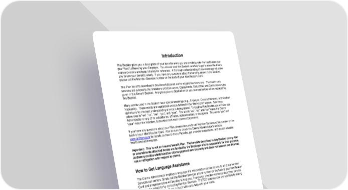 7 Introduction This Booklet gives you a description of your benefits while you are enrolled under the health care plan (the Plan) offered by your Employer. You should read this Booklet carefully to get to know the Plans main provisions and keep it handy for reference . A thorough understanding of your coverage will allow you to use your benefits wisely. If you have any questions about the benefits shown in this Booklet, please call the Member Services number on the back of your Identification Card . The Plan benefits described in this Benefit Booklet are for eligible Members only. The health care services are subject to the limitations and Exclusions, Copayments, Deductible, and Coinsurance rules given in this Benefit Booklet. Any group plan or Book let which you received before will be replaced by this Booklet. Many words used in the Booklet have special meanings (e.g., Employer, Covered Services, and Medical Necessity). These words are capitalized and are defined in the "Definitions" section. See these definitions for the best understanding of what is being st ated. Throughout this Booklet you will also see references to we, us, our, you, and your. The words we, us, and our mean the Claims Administrator or any of its subsidiaries, affiliates, subcontractors, or designees . The words you and your mean the Member, Subscriber and each covered Dependent. If you have any questions about your Plan, please be sure to call Member Services at the number on the back of your Identification Card. Also be sure to check the Claims Administrators website, www.anthem.com for details on how to find a Provider, get answers to questions, and access valuable health and wellness tips. Important: This is not an insured benefit Plan. The benefits described in this Booklet or any rider or amendments attached hereto are funded by the Employer who is responsible for their payment. Anthem provides administrative claims payment services onl y and does not assume any financial risk or obligation with respect to claims. How to Get Language Assistance The Claims Administrator employs a language line interpretation service for use by all of our Member Services call centers. Simply call the Member Services phone number on the back of your Identification Card and a representative will be able to help you. Translation of written materials about your benefits can also be asked for by contacting Member Services. TTY/TDD services also are available by dialing 711. A special operator will get in touch with us to help with your needs.
