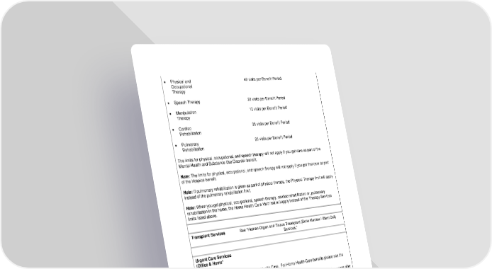 27 Physical and Occupational Therapy 40 visits per Benefit Period Speech Therapy 20 visits per Benefit Period Manipulation Therapy 12 visits per Benefit Period Cardiac Rehabilitation 36 visits per Benefit Period Pulmonary Rehabilitation 20 visits per Benefit Period The limits for physical, occupational, and speech therapy will not apply if you get care as part of the Mental Health and Substance Use Disorder benefit. Note: The limits for physical, occupational, and speech therapy will not apply if you get that care as part of the Hospice benefit. Note: If pulmonary rehabilitation is given as part of physical therapy, the Physical Therapy limit will apply instead of the p ulmonary r ehabilitation limit. Note: When you get physical, occupational, speech therapy , cardiac rehabilitation or , pulmonary rehabilitation in the home, the Home Health Care Visit limit will apply instead of the Therapy Services limits listed above. Transplant Services See Human Organ and Tissue Transplant (Bone Marrow / Stem Cell) Services. Urgent Care Services (Office & Home* Visits) * Home visits are not the same as Home Health Care. For Home Health Care benefits please see the "Home Health Care" section. Urgent Care Visit Charge $75 Copayment per visit 40% Coinsurance after Deductible 50% Coinsurance after Deductible Allergy Testing 20% Coinsurance after Deductible 40% Coinsurance after Deductible 50% Coinsurance after Deductible Shots / Injections (other than allergy serum) 20% Coinsurance after Deductible 40% Coinsurance after Deductible 50% Coinsurance after Deductible Allergy Shots / Injections (including allergy serum) A $10 Copayment for allergy 20% Coinsurance after Deductible 40% Coinsurance after Deductible 50% Coinsurance after Deductible