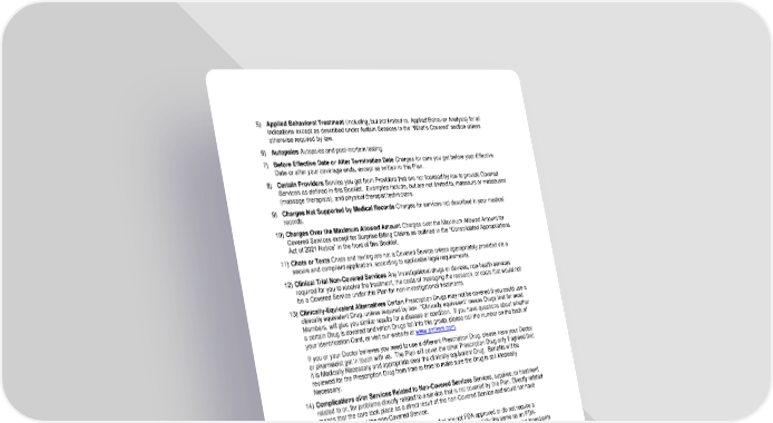 67 5) Applied Behavioral Treatment (including, but not limited to, Applied Behavior Analysis ) for all indications except as described under Autism Services in the Whats Covered section unless otherwise required by law. 6) Autopsies Autopsies and post - mortem testing. 7) Before Effective Date or After Termination Date Charges for care you get before your Effective Date or after your coverage ends, except as written in this Plan. 8) Certain Providers Service you get from Providers that are not licensed by law to provide Covered Services as defined in this Booklet. Examples include, but are not limited to, masseurs or masseuses (massage therapists), and physical therapist technicians. 9) Charges Not Supported by Medical Records Charges for services not described in your medical records. 10) Charges Over the Maximum Allowed Amount Charges over the Maximum Allowed Amount for Covered Services except for Surprise Billing Claims as outlined in the Consolidated Appropriations Act of 2021 Notice in the front of this Booklet . 11) Chats or Texts Chats and texting are not a Covered Service unless appropriately provided via a secure and compliant application, according to applicable legal requirements. 12) Clinical Trial Non - Covered Services Any Investigational drugs or devices, non - health services required for you to receive the treatment, the costs of managing the research, or costs that would not be a Covered Service under this Plan for non - Investigational treatments. 13) Clinically - Equivalent Alternatives Certain Prescription Drugs may not be covered if you could use a clinically equivalent Drug, unless required by law. Clinically equivalent means Drugs that for most Members, will give you similar results for a disease or condition. If you have questio ns about whether a certain Drug is covered and which Drugs fall into this group, please call the number on the back of your Identification Card, or visit our website at www.anthem.com . If you or your Doctor believes you need to use a different Prescription Drug, please have your Doctor or pharmacist get in touch with us. The Plan will cover the other Prescription Drug only if agreed that it is Medically Necessary and appropriate over the clin ically equivalent Drug. Benefits will be reviewed for the Prescription Drug from time to time to make sure the Drug is still Medically Necessary . 14) Complications of/or Services Related to Non - Covered Services Services, supplies, or treatment related to or, for problems directly related to a service that is not covered by this Plan. Directly related means that the care took place as a direct result of the non - Covered Service and would not have taken place withou t the non - Covered Service. 15) Compound Ingredients Compound ingredients that are not FDA approved or do not require a prescription to dispense, and the compound medication is not essentially the same as an FDA - approved product from a drug manufacturer. Exceptions to non - FDA approved compound ingredients may include multi - source, non - proprietary vehicles and/or p harmaceutical adjuvants. 16) Cosmetic Services Treatments, services, Prescription Drugs, equipment , or supplies given for cosmetic services. Cosmetic services are meant to preserve, change , or improve how you look or are given for social reasons. No benefits are available for surgery or treatments to change the texture or look of your skin or to change the size, shape or look of facial or body features (such as your nose, eyes, ears, cheeks , chin, chest or breasts) . This Exclusion does not apply to reconstructive surgery for breast symmetry after a mastectomy and surgery to correct birth defects and birth abnormalities. 17) Court Ordered Testing Court ordered testing or care unless Medically Necessary. 18) Crime Treatment of an injury or illness that results from a crime you committed, or tried to commit. This Exclusion does not apply if your involvement in the crime was solely the result of a medical or mental condition, or where you were the victim of a crime, including domestic violence.