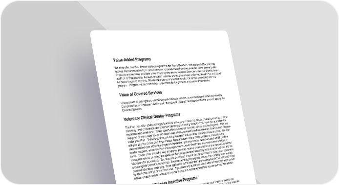 110 Value - Added Programs We may offer health or fitness related programs to the Plans Members, through which Members may access discounted rates from certain vendors for products and services available to the general public. Products and services available under this program are not Covered Services under your Plan but are in addition to Plan benefits. As such, program features are not guaranteed under your health Plan and could be discontinued at any time. We do not endorse any vendor, product or service associated with this pro gram. Program vendors are solely responsible for the products and services you receive. Value of Covered Services For purposes of subrogation, reimbursement of excess benefits, or reimbursement under any Workers Compensation or Employer Liability Law, the value of Covered Services shall be the amount paid for the Covered Services. Voluntary Clinical Quality Programs The Plan may offer additional opportunities to assist you in obtaining certain covered preventive or other care (e.g., well child check - ups or certain laboratory screening tests) that you have not received in the recommended timeframe. These opportunities are called voluntary clinical quality programs. They are designed to encourage you to get certain care when you need it and are separate from Covered Services under your Plan. These programs are not guaranteed and could be discontinued at any time. The Plan will give you the choice and if you choose to participate in one of these programs, and obtain the recommended care within the programs timeframe, you may receive incentives such as gift cards or retailer coupons, which the Plan encourage s you to use for health and wellness related activities or items. Under other clinical quality programs, you may receive a home test kit that allows you to test for immediate results or collect the specimen for certain covered laboratory tests at home and mail it to the laboratory for processing. You may also be offered a home visit appointment to collect such specimens and complete biometric screenings. You may need to pay any cost shares that normally apply to such covered laboratory tests (e.g., those applicable to the laboratory processing fee) but will not need to pay for the home test kit or the home visit. If you have any questions about whether receipt of a gift card or retailer coupon results in taxable income to you, it is recommended that you consult your tax advisor. Voluntary Wellness Incentive Programs We may offer health or fitness related program options for purchase by your Employer to help you achieve your best health. These programs are not Covered Services under your Plan, but are separate components, which are not guaranteed under this Plan and c ould be discontinued at any time. If your Employer has selected one of these options to make available to all employees, you may receive incentives such as gift cards by participating in or completing such voluntary wellness promotion programs as health a ssessments, weight management or tobacco cessation coaching. Under other options your Employer may select, you may receive such incentives by achieving specified standards based on health factors under wellness programs that comply with applicable law. If you think you might be unable to meet the Standard: , you might qualify for an opportunity to earn the same reward by different means. You may contact us at the Member Services number on your ID card and we will work with you (and, if you wish, your Doct or) to find a wellness program with the same reward that is right for you in light of your health status. (If you receive a gift card as a wellness reward and use it for purposes other than for qualified medical expenses, this may result in taxable income to you. For additional guidance, please consult your tax advisor.) Waiver