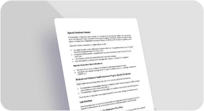96 Special Enrollment Periods If a Subscriber or Dependent does not apply for coverage when they were first eligible, they may be able to join the Plan prior to Open Enrollment if they qualify for Special Enrollment. Except as noted otherwise below, the Subscriber or Dependent must request Special Enrollment within 31 days of a qualifying event. Special Enrollment is available for eligible individuals who: Lost eligibility under a prior health plan for reasons other than non - payment of fees or due to fraud or intentional misrepresentation of a material fact; Exhausted COBRA benefits or stopped receiving group contributions toward the cost of the prior health plan; Lost employer contributions towards the cost of the other coverage; Are now eligible for coverage due to marriage, birth, adoption, or placement for adoption. Important Notes about Special Enrollment: Members who enroll during Special Enrollment are not considered Late Enrollees. Individuals must request coverage within 31 days of a qualifying event (i.e., marriage, exhaustion of COBRA, etc.). Medicaid and Childrens Health Insurance Program Special Enrollment Eligible Subscribers and Dependents may also enroll under two additional circumstances: The Subscribers or Dependents Medicaid or Childrens Health Insurance Program (CHIP) coverage is terminated as a result of loss of eligibility; or The Subscriber or Dependent becomes eligible for a subsidy (state premium assistance program). The Subscriber or Dependent must request Special Enrollment within 60 days of the above events. Late Enrollees If the Subscriber does not enroll themselves and/or their Dependents when first eligible or during a Special Enrollment period, will not be eligible to enroll until the next Open Enrollment Period. Members Covered Under the Employers Prior Plan Members who were previously enrolled under another plan offered by the Employer that is being replaced by this Plan are eligible for coverage on the Effective Date of this coverage. Enrolling Dependent Children Newborn Children Newborn children are covered automatically from the moment of birth for a period of 31 days. To continue coverage beyond the 31 day period you should submit an application / change form to the Employer, within 31 days following the birth, to add the newbo rn to your Plan. Even if no additional Fees are required, you should still submit an application / change form to the Employer to add the newborn to your Plan, to make sure we have accurate records and are able to cover your claims.