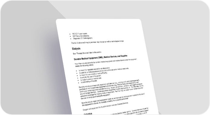 47 PET/CT Fusion scans QCT Bone Densitometry Diagnostic CT Colonography The list of advanced imaging services may change as medical technologies change. Dialysis See Therapy Services later in this section. Durable Medical Equipment (DME), Medical Devices, and Supplies Your Plan includes benefits for durable medical equipment and medical devices when the equipment meets the following criteria: Is meant for repeated use and is not disposable. Is used for a medical purpose and is of no further use when medical need ends. Is meant for use outside a medical Facility. Is only for the use of the patient. Is made to serve a medical use. Is ordered by a Provider. Benefits include purchase - only equipment and devices (e.g., crutches and customized equipment), purchase or rent - to - purchase equipment and devices (e.g., Hospital beds and wheelchairs), and continuous rental equipment and devices (e.g., oxygen concentrator , ventilator, and negative pressure wound therapy devices). Continuous rental equipment must be approved by us. The Plan may limit the amount of coverage for ongoing rental of equipment. The Plan may not cover more in rental costs than the cost of simply purchasing the equipment. Benefits include repair and replacement costs as well as supplies and equipment needed for the use of the equipment or device, for example, a battery for a powered wheelchair. Oxygen and equipment for its administration are also Covered Services. Orthotics Benefits are available for certain types of orthotics (braces, boots, splints). Covered Services include the initial purchase, fitting, and repair of a custom made rigid or semi - rigid supportive device used to support, align, prevent, or correct deformities or to improve the function of movable parts of the body, or which limits or st ops motion of a weak or diseased body part. Orthotic appliances may be replaced once per year per Member when Medically Necessary in the Members situation. However, additional replacements will be allowed for Members under age 18 due to rapid growth, or for any Member when an appliance is damaged and cannot be repaired. Coverage for an orthotic c ustom fabricated brace or support designed as a component for a prosthetic limb is described in more detail below. Prosthetics Your Plan also includes benefits for prosthetics, which are artificial substitutes for body parts for functional or therapeutic purposes, when they are Medically Necessary for activities of daily living.