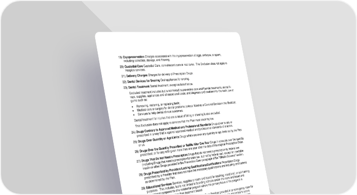68 19) Cryopreservation Charges associated with the cryopreservation of eggs, embryos, or sperm, including collection, storage, and thawing. 20) Custodial Care Custodial Care, convalescent care or rest cures. This Exclusion does not apply to Hospice services. 21) Delivery Charges Charges for delivery of Prescription Drugs . 22) Dental Devices for Snoring Oral appliances for snoring. 23) Dental Treatment Dental treatment, except as listed below. Excluded treatment includes but is not limited to preventive care and fluoride treatments; dental X - rays, supplies, appliances and all associated costs; and diagnosis and treatment for the teeth, jaw or gums such as: Removing, restoring , or replacing teeth; Medical care or surgery for dental problems (unless listed as a Covered Service in this Booklet); Services to help dental clinical outcomes. Dental treatment for injuries that are a result of biting or chewing is also excluded. This Exclusion does not apply to services that the Plan must cover by law. 24) Drugs Contrary to Approved Medical and Professional Standards Drugs given to you or prescribed in a way that is against approved medical and professional standards of practice. 25) Drugs Over Quantity or Age Limits Drugs which are over any quantity or age limits set by the Plan or us. 26) Drugs Over the Quantity Prescribed or Refills After One Year Drugs in amounts over the quantity prescribed, or for any refill given more than one year after the date of the original Prescription Order. 27) Drugs That Do Not Need a Prescription Drugs that do not need a prescription by federal law (including Drugs that need a prescription by state law, but not by federal law), except for injectable insulin or other Drugs provided in the Preventive Care paragraph of the "Whats Covered" section . 28) Drugs Prescribed by Providers Lacking Qualifications/Certifications Prescription Drugs prescribed by a Provider that does not have the necessary qualifications and including certifications as determined by the Plan. 29) Educational Services Services, supplies or room and board for teaching, vocational, or self - training purposes. This includes, but is not limited to boarding schools and/or the room and board and educational components of a residential program where the primary focus of the pr ogram is educational in nature rather than treatment based. 30) Emergency Room Services for non - Emergency Care Services provided in an emergency room for conditions that do not meet the definition of Emergency. This includes, but is not limited to suture removal in an emergency room. For non - emergency care please use the closest network Urgent Care Center or your Primary Care Physician. 31) Experimental or Investigational Services Services or supplies that are found to be Experimental / Investigational. This also applies to services related to Experimental / Investigational services, whether you get them before, during, or after you get the Experimental / Investigational service or supply. The fact that a service or supply is the only available treatment will not make it Covered Service if we conclude it is Experimental / Investigational. Details on the criteria we use to determine if a Service is Experimental or Investigational is outlined below. 32) Eyeglasses and Contact Lenses Eyeglasses and contact lenses to correct your eyesight unless listed as covered in this Booklet. This Exclusion does not apply to lenses needed after a covered eye surgery. 33) Eye Exercises Orthoptics and vision therapy.