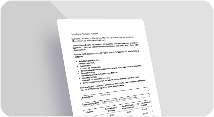 13 Claims Payment section for more details. Deductibles, Coinsurance, and Benefit Period Maximums are calculated based upon the Maximum Allowed Amount, not the Providers billed charges. Essential Health Benefits provided within this Booklet are not subject to lifetime or annual dollar maximums. Certain non - essential health benefits, however, are subject to either a lifetime and/or dollar maximum. Essential Health Benefits are defined by federal law and refer to benefits in at least the following categories: Ambulatory patient services, Emergency services, Hospitalization, Maternity and newborn care, Mental H ealth and S ubstance U se D isorder services, including behavioral health treatment, Prescription drugs , Rehabilitative and habilitative services and devices, Laboratory services, Preventive and wellness services, and Chronic disease management and pediatric services, including oral and vision care. Such benefits shall be consistent with those set forth under the Patient Protection and Affordable Care Act of 2010 and any regulations issued pursuant thereto. Benefit Period Calendar Year Dependent Age Limit To the end of the month in which the child attains age 26. D eductible Tier 1 In - Network Providers Tier 2 All Other In - Network Providers Tier 3 Out - of - Network Providers Per Member $2,000 $5,000 $15,000 Per Family All other Members combined $4,000 $10,000 $30,000 Note: The Tier 1 and Tier 2 Deductibles are combined and accumulate toward each other, but the Tier 3 Deductible is separate. When the Deductible applies, you must pay it before benefits begin. See the sections below to find out when the Deductible applies Copayments and Coinsurance are separate from and do not apply to the Deductible Coinsurance Tier 1 In - Network Providers Tier 2 All Other In - Network Providers Tier 3 Out - of - Network Providers
