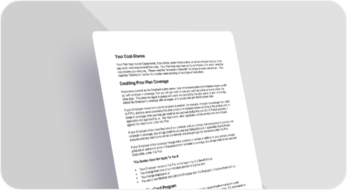 35 Your Cost - Shares Your Plan may involve Copayments, Deductibles, and/or Coinsurance, which are charges that you must pay when receiving Covered Services. Your Plan may also have an Out - of - Pocket Limit, which limits the cost - shares you must pay. Please read the Schedule o f Benefits for details on your cost - shares. Also read the Definitions section for a better understanding of each type of cost share. Crediting Prior Plan Coverage If you were covered by the Employers prior carrier / plan immediately before the Employer signs up with us, with no break in coverage, then you will get credit for any accrued Deductible amounts under that other plan. This does not apply to people who we re not covered by the prior carrier or plan on the day before the Employers coverage with us began, or to people who join the Employer later. If your Employer moves from one of our plans to another, (for example, changes its coverage from HMO to PPO), and you were covered by the other product immediately before enrolling in this product with no break in coverage, then you may get credit for any accrued Deductible and Out of Pocket amounts, if applicable and approved by us. Any maximums, when applicable, will be carried over and charged against the maximums under this Plan. If your Employer offers more than one of our products, and you change from one product to another with no break in coverage, you will get credit for any accrued Deductible and, if applicable, Out of Pocket amounts and any maximums will be carried over and charged against maximums under this Plan. If your Employer offers coverage through other products or carriers in addition to ours, and you change products or carriers to enroll in this product with no break in coverage, you will get credit for any accrued Deductible, under this Plan. This Section Does Not Apply To You If: Your Employer moves to this Plan at the beginning of a Benefit Period; You change from one of our individual policies to a group plan; You change employers; or You are a new Member who joins the Employer after the Employer's initial enrollment with us. The BlueCard Program Like all Blue Cross & Blue Shield plans throughout the country, we participate in a program called " BlueCard " which provides services to you when you are outside our Service Area. For more details on this program, please see Inter - Plan Arrangements in the Claims Payment section. Identification Card We will give an Identification Card to each Member enrolled in the Plan. When you get care, you must show your Identification Card. Only covered Members have the right to services or benefits under this Booklet . If anyone gets services or benefits to which they are not entitled to under the terms of this Booklet, he/she must pay for the actual cost of the services.