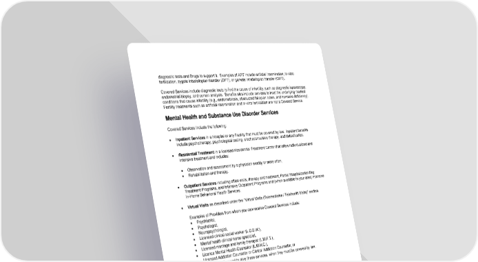 56 diagnostic tests and Drugs to support it. Examples of ART include artificial insemination, in - vitro fertilization, zygote intrafallopian transfer (ZIFT), or gamete intrafallopian transfer (GIFT). Covered Services include diagnostic tests to find the cause of infertility, such as diagnostic laparoscopy, endometrial biopsy, and semen analysis. Benefits also include services to treat the underlying medical conditions that cause infertility (e.g., end ometriosis, obstructed fallopian tubes, and hormone deficiency). Fertility treatments such as artificial insemination and in - vitro fertilization are not a Covered Service. Mental Health and Substance Use Disorder Services Covered Services include the following: Inpatient Services in a Hospital or any Facility that must be covered by law. Inpatient benefits include psychotherapy, psychological testing, electroconvulsive therapy, and detoxification. Residential Treatment in a licensed Residential Treatment Center that offers individualized and intensive treatment and includes: Observation and assessment by a physician weekly or more often, Rehabilitation and therapy. Outpatient Services including office visits, therapy and treatment, Partial Hospitalization/Day Treatment Programs, and Intensive Outpatient Programs and (when available in your area) Intensive In - Home Behavioral Health Services. Virtual Visits as described under the Virtual Visits (Telemedicine / Telehealth Visits) section. Examples of Providers from whom you can receive Covered Services include: Psychiatrist, Psychologist, Neuropsychologist, Licensed clinical social worker (L.C.S.W.), Mental health clinical nurse specialist, Licensed marriage and family therapist (L.M.F.T.), License Mental Health Counselor (L.M.H.C.), Licensed Addiction Counselor or Clinical Addiction Counselor, or Any agency licensed to give these services, when they must be covered by law . Occupational Therapy Please see Therapy Services later in this section. Office and Home Visits Covered Services include: Office Visits for medical care (including second surgical opinions) to examine, diagnose, and treat an illness or injury. Home Visits for medical care to examine, diagnose, and treat an illness or injury. Please note that Doctor and Primary Care Provider visits in the home are different than the Home Health Care Services benefit described earlier in this Booklet. Consultations between your Primary Care Physician and a Specialist, when approved by the Plan.