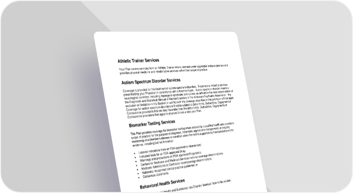 43 Athletic Trainer Services Your Plan covers services from an Athletic Trainer who is licensed under applicable Indiana state law and provides physical medicine and rehabilitative services within their scope of practice. Autism Spectrum Disorder Services Coverage is provided for the treatment of autism spectrum disorders. Treatment is limited to services prescribed by your Physician in accordance with a treatment plan. Autism spectrum disorder means a neurological condition, including Asperger's syndrome and autism, as defined in the most recent edition of the Diagnostic and Statistical Manual of Mental Disorders of the American Psychiatric Association. Any exclusion or limitation in this Booklet in conflict with the coverage described in this provision will not apply . Coverage for autism spectrum disorders will not be subject to dollar limits, Deductibles, Copayment or Coinsurance provisions that are less favorable than the dollar limits, Deductibles, Copayments or Coinsurance provisions that apply to physical illness under your Plan. Biomarker Testing Services This Plan provides coverage for biomarker testing when ordered by a qualified health care providers scope of practice for the purpose of diagnosis, treatment, appropriate management, or ongoing monitoring of a Members disease or condition when the test i s supported by medical and scientific evidence, including but not limited to: Labeled indications from an FDA - approved or cleared test; Indicated tests for an FDA - approved Drug; Warnings and precautions on FDA - approved Drug labels; Centers for Medicare and Medicaid Services national coverage determinations; Medicare Administrative Contractor local coverage determinations; Nationally recognized clinical practice guidelines; or Consensus statements. Behavioral Health Services Please see Mental Health and Substance Use Disorder Services later in this section. Cardiac Rehabilitation Please see Therapy Services later in this section . Cellular and Gene Therapy Services Your Plan includes benefits for certain cellular and gene therapy services, when Anthem approves the benefits in advance through Precertification. See the section Human Organ and Tissue Transplant (Bone Marrow / Stem Cell), Cellular and Gene Therapy Services for additional details. Chemotherapy Please see Therapy Services later in this section.