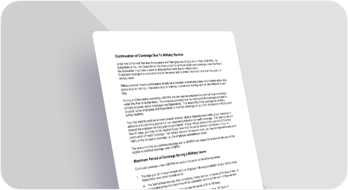 103 Continuation of Coverage Due To Military Service Under the Uniformed Services Employment and Reemployment Rights Act of 1994 (USERRA), the Subscriber or his / her Dependents may have a right to continue health care coverage under the Plan if the Subscriber must take a leave of absence from work due to mi litary leave. Employers must give a cumulative total of five years and in certain instances more than five years, of military leave. Military service means performance of duty on a voluntary or involuntary basis and includes active duty, active duty for training, initial active duty for training, inactive duty training, and full - time National Guard duty. During a military leave covered by USERRA, the law requires employers to continue to give coverage under this Plan to its Members. The coverage provided must be identical to the coverage provided to similarly situated, active employees and Dependents. Th is means that if the coverage for similarly situated, active employees and Dependents is modified, coverage for you (the individual on military leave) will be modified. You may elect to continue to cover yourself and your eligible Dependents by notifying your employer in advance and submitting payment of any required contribution for health coverage. This may include the amount the employer normally pays on your behalf. If your military service is for a period of time less than 31 days, you may not be required to pay more than the active Member contribution, if any, for continuation of health coverage. For military leaves of 31 days or more, you may be required to pay u p to 102% of the full cost of coverage, i.e., the employee and employer share. The amount of time you continue coverage due to USERRA will reduce the amount of time you will be eligible to continue coverage under COBRA. Maximum Period of Coverage During a Military Leave Continued coverage under USERRA will end on the earlier of the following events: 1. The date you fail to return to work with the Employer following completion of your military leave. Subscribers must return to work within: a) The first full business day after completing military service, for leaves of 30 days or less. A reasonable amount of travel time will be allowed for returning from such military service. b) 14 days after completing military service for leaves of 31 to 180 days, c) 90 days after completing military service for leaves of more than 180 days; or 2. 24 months from the date your leave began. Reinstatement of Coverage Following a Military Leave Regardless of whether you continue coverage during your military leave, if you return to work your health coverage and that of your eligible Dependents will be reinstated under this Plan if you return within: 1. The first full business day of completing your military service, for leaves of 30 days or less. A reasonable amount of travel time will be allowed for returning from such military service; 2. 14 days of completing your military service for leaves of 31 to 180 days; or 3. 90 days of completing your military service for leaves of more than 180 days.