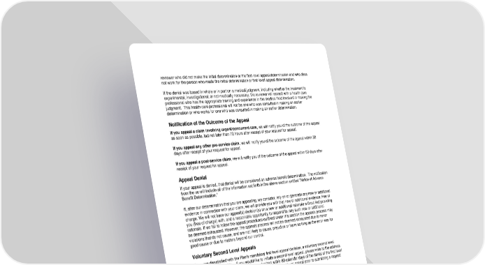 92 reviewer who did not make the initial determination or the first - level appeal determination and who does not work for the person who made the initial determination or first - level appeal determination. If the denial was based in whole or in part on a medical judgment, including whether the treatment is experimental, investigational, or not medically necessary, the reviewer will consult with a health care professional who has the appropriate training and experience in the medical field involved in making the judgment. This health care professional will not be one who was consulted in making an earlier determination or who works for one who was consulted in making an earlier determination. Notification of the Outcome of the Appeal If you appeal a claim involving urgent/concurrent care , we will notify you of the outcome of the appeal as soon as possible, but not later than 72 hours after receipt of your request for appeal. If you appeal any other pre - service claim , we will notify you of the outcome of the appeal within 30 days after receipt of your request for appeal. If you appeal a post - service claim , we will notify you of the outcome of the appeal within 60 days after receipt of your request for appeal. Appeal Denial If your appeal is denied, that denial will be considered an adverse benefit determination. The notification from the us will include all of the information set forth in the above section entitled Notice of Adverse Benefit Determination. If, after our determination that you are appealing, we consider, rely on or generate any new or additional evidence in connection with your claim, we will provide you with that new or additional evidence, free of charge. We will not base our appeal(s) decision(s) on a new or additional rationale without first providing you (free of charge) with, and a reasonable opportunity to respond to, any such new or additional rationale. If we fail to follow the appeal procedures outlined under this section the appeals process may be deemed exhausted. However, the appeals process will not be deemed exhausted due to minor violations that do not cause, and are not likely to cause, prejudice or harm so long as the error was for good cause or due to matters beyond our contr ol. Voluntary Second Level Appeals If you are dissatisfied with the Plan's mandatory first level appeal decision, a voluntary second level appeal may be available. If you would like to initiate a second level appeal, please write to the address listed above. Voluntary appeals must be submitted within 60 calendar days of the denial of the first level appeal. You are not required to complete a voluntary second level appeal prior to submitting a request for an independent External Review. External Review If the outcome of the mandatory first level appeal is adverse to you and it was based on medical judgment, or if it pertained to a rescission of coverage, you may be eligible for an independent External Review pursuant to federal law. You must submit your request for External Review to us within four (4) months of the notice of your final internal adverse determination. A request for an External Review must be in writing unless we determine that it is not reasonable to require a written statement. You do not have to re - send the information that you submitted for internal appeal. However, you are encouraged to submit any additional information that you think is important for review. For pre - service claims involving urgent/concurrent care, you may proceed with an Expedited External Review without filing an internal appeal or while simultaneously pursuing an expedited appeal through our