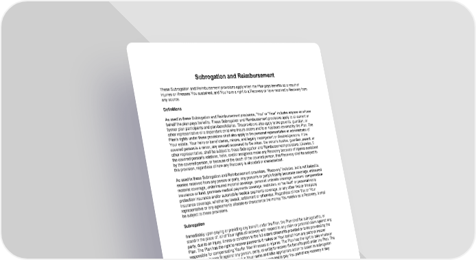 86 Subrogation and Reimbursement These Subrogation and Reimbursement provisions apply when the Plan pays benefits as a result of injuries or illnesses You sustained, and You have a right to a Recovery or have received a Recovery from any source. Definitions As used in these Subrogation and Reimbursement provisions, You or Your includes anyone on whose behalf the plan pays benefits. These Subrogation and Reimbursement provisions apply to all current or former plan participants and plan beneficiaries. The p rovisions also apply to the parents, guardian, or other representative of a dependent child who incurs claims and is or has been covered by the Plan. The Plans rights under these provisions shall also apply to the personal representative or administrator of Your estate, Your heirs or beneficiaries, minors, and legally incompetent or disabled persons. If the covered person is a minor, any amount recovered by the minor, the minors trustee, guardian, parent, or other representative, shall be subject to these Subrogation and Reimbursement provisions. Likewise, if the covered persons relatives, heirs, and/or assignees make any Recovery because of injuries sustained by the covered person, or because of the death of the covered person, that Recovery shall be sub ject to this provision, regardless of how any Recovery is allocated or characterized. As used in these Subrogation and Reimbursement provisions, Recovery includes, but is not limited to, monies received from any person or party, any persons or partys liability insurance coverage, uninsured motorist coverage, underinsured motorist covera ge, personal umbrella coverage, workers compensation insurance or fund, premises medical payments coverage, restitution, or no - fault or personal injury protection insurance and/or automobile medical payments coverage, or any other first or third party i nsurance coverage, whether by lawsuit, settlement or otherwise. Regardless of how You or Your representative or any agreements allocate or characterize the money You receive as a Recovery, it shall be subject to these provisions. Subrogation Immediately upon paying or providing any benefit under the Plan, the Plan shall be subrogated to, or stand in the place of, all of Your rights of recovery with respect to any claim or potential claim against any party, due to an injury, illness or conditio n to the full extent of benefits provided or to be provided by the Plan. The Plan has the right to recover payments it makes on Your behalf from any party or insurer responsible for compensating You for Your illnesses or injuries. The Plan has the right to take whatever legal action it sees fit against any person, party, or entity to recover the benefits paid under the Plan. The Plan may assert a claim or file suit in Your name and take appropriate action to assert its subrogation claim, with or without You r consent. The Plan is not required to pay You part of any recovery it may obtain, even if it files suit in Your name. Reimbursement If You receive any payment as a result of an injury, illness or condition, You agree to reimburse the Plan first from such payment for all amounts the Plan has paid and will pay as a result of that injury, illness or condition, up to and including the full amount of Your recovery. If You obtain a Recovery and the Plan has not been repaid for the benefits the Plan paid on Your behalf, the Plan shall have a right to be repaid from the Recovery in the amount of the benefits paid on Your behalf. You must prompt ly reimburse the Plan from any Recovery to the extent of benefits the Plan paid on Your behalf regardless of whether the payments You receive make You whole for Your losses, illnesses and/or injuries. Secondary to Other Coverage The Plan shall be secondary in coverage to any medical payments provision, no - fault automobile insurance policy, or personal injury protection policy regardless of any election made by You to the