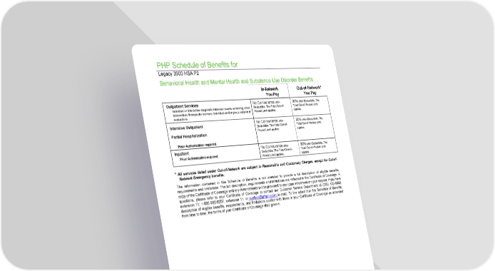 PHP Schedule of Benefits for Legacy 3500 HSA P2 Behavioral Health and Mental Health and Substance Use Disorder Benefits In-Network You Pay Outpatient Services Individual or interactive diagnostic interview exams or testing; crisis intervention; therapeutic services; individual and/or group outpatient evaluations. No Coinsurance after Deductible. The Total Out-of- Pocket Limit applies. 30% after Deductible. The Total Out-of-Pocket Limit applies. Intensive Outpatient Partial Hospitalization Prior Authorization required. No Coinsurance after Deductible. The Total Out-of- Pocket Limit applies. 30% after Deductible. The Total Out-of-Pocket Limit applies. Inpatient Prior Authorization required. No Coinsurance after Deductible. The Total Out-of- Pocket Limit applies. 30% after Deductible. The Total Out-of-Pocket Limit applies. * All services listed under Out-of-Network are subject to Reasonable and Customary Charges, except for Out-of- Network Emergency benefits. The information contained in this Schedule of Benefits is not intended to provide a full description of eligible benefits, requirements and limitations. The full description, requirements and limitations are reflected in the Certificate of Coverage. A copy of the Certificate of Coverage and any Amendments will be provided to you upon enrollment or upon request. If you have questions, please refer to your Certificate of Coverage or contact our Customer Service Department at (260) 432-6690, extension 11; 1-800-982-6257, extension 11; or custsvc@phpni.com (e-mail). To the extent that this Schedule of Benefits, description of eligible benefits, requirements, and limitations conflict with those in your Certificate of Coverage as amended from time to time, the terms of your Certificate of Coverage shall govern. PHP.POS.LG.NGF.SOBHDHP.01-PUBLISHED 2024 QP250016_L 6.03.2025 Out-of-Network* You Pay