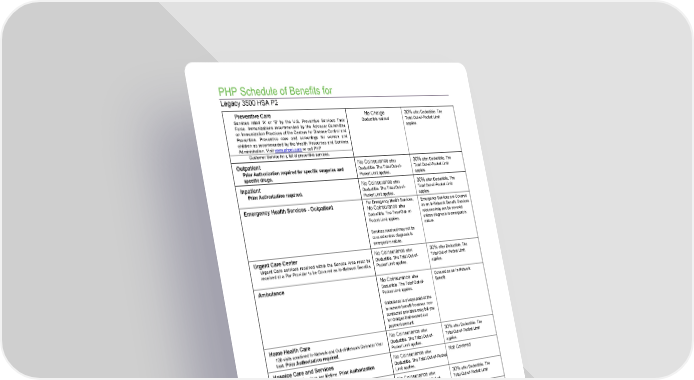 PHP Schedule of Benefits for Legacy 3500 HSA P2 Preventive Care Services rated 'A' or 'B' by the U.S. Preventive Services Task Force. Immunizations recommended by the Advisory Committee on Immunization Practices of the Centers for Disease Control and Prevention. Preventive care and screenings for women and children as recommended by the Health Resources and Services Administration. Visit www.phpni.com or call PHP No Charge Deductible waived 30% after Deductible. The Total Out-of-Pocket Limit applies. Customer Service for a list of preventive services. Outpatient Prior Authorization required for specific surgeries and specific drugs. No Coinsurance after Deductible. The Total Out-of- Pocket Limit applies. 30% after Deductible. The Total Out-of-Pocket Limit applies. Inpatient Prior Authorization required. No Coinsurance after Deductible. The Total Out-of- Pocket Limit applies. 30% after Deductible. The Total Out-of-Pocket Limit applies. Emergency Health Services - Outpatient For Emergency Health Services, No Coinsurance after Deductible. The Total Out- of- Pocket Limit applies. Services received may not be covered unless diagnosis is emergent in nature. Emergency Services are Covered as an In-Network Benefit. Services received may not be covered unless diagnosis is emergent in nature. Urgent Care Center Urgent Care services received within the Service Area must be received at a Par Provider to be Covered as In-Network Benefits. No Coinsurance after Deductible. The Total Out-of- Pocket Limit applies. 30% after Deductible. The Total Out-of-Pocket Limit applies. Ambulance No Coinsurance after Deductible. The Total Out-of- Pocket Limit applies. Ambulance is always paid at the in-network benefit however, non- contracted providers may bill you for charges that exceed our payment amount. Covered as an In-Network Benefit. Home Health Care 100 visits combined In-Network and Out-of-Network Calendar Year limit. Prior Authorization required. No Coinsurance after Deductible. The Total Out-of- Pocket Limit applies. 30% after Deductible. The Total Out-of-Pocket Limit applies. Hospice Care and Services 180 consecutive days per lifetime. Prior Authorization required. No Coinsurance after Deductible. The Total Out-of-Pocket Limit applies. Not Covered Inpatient Transitional Care Unit 30 day combined In-Network and Out-of-Network Calendar Year limit. Prior Authorization required. No Coinsurance after Deductible. The Total Out-of- Pocket Limit applies. 30% after Deductible. The Total Out-of-Pocket Limit applies. Durable Medical Equipment, Prosthetics, Orthotic Appliances and Ostomy Supplies Prior Authorization required for specific DME, prosthetics and Orthotic Appliances. No Coinsurance after Deductible. The Total Out-of- Pocket Limit applies. 30% after Deductible. The Total Out-of-Pocket Limit applies. Outpatient Therapy Services - Rehabilitation Services Combined In-Network and Out-of-Network limit per Calendar Year: - Physical therapy: 40 visits - Occupational therapy: 40 visits - Speech therapy: 40 visits - Cardiac Rehabilitation: 36 visits - Pulmonary Rehabilitation: 20 visits No Coinsurance after Deductible. The Total Out-of- Pocket Limit applies. 30% after Deductible. The Total Out-of-Pocket Limit applies. PHP.POS.LG.NGF.SOBHDHP.01-PUBLISHED 2024 QP250016_L 6.03.2025