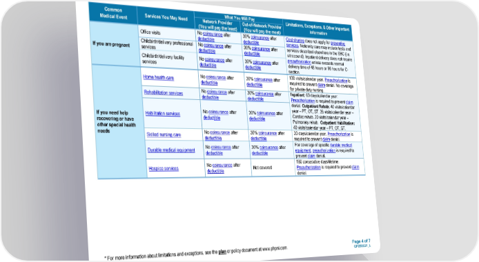 Page 4 of 7 QP250021_L * For more information about limitations and exceptions, see the plan or policy document at www.phpni.com. Common Medical Event Services You May Need What You Will Pay Limitations, Exceptions, & Other Important Information Network Provider (You will pay the least) Out-of-Network Provider (You will pay the most) If you are pregnant Office visits No coinsurance after deductible 30% coinsurance after deductible Cost sharing does not apply for preventive services. Maternity care may include tests and services described elsewhere in the SBC (i.e. ultrasound). Inpatient delivery does not require preauthorization unless exceeds normal delivery time of 48 hours or 96 hours for C- section. Childbirth/delivery professional services No coinsurance after deductible 30% coinsurance after deductible Childbirth/delivery facility services No coinsurance after deductible 30% coinsurance after deductible If you need help recovering or have other special health needs Home health care No coinsurance after deductible 30% coinsurance after deductible 100 visits/calendar year. Preauthorization is required to prevent claim denial. No coverage for private-duty nursing. Rehabilitation services No coinsurance after deductible 30% coinsurance after deductible Inpatient: 60 days/calendar year. Preauthorization is required to prevent claim denial. Outpatient Rehab: 40 visits/calendar year – PT, OT, ST. 36 visits/calendar year – Cardiac rehab. 20 visits/calendar year – Pulmonary rehab. Outpatient Habilitation: 40 visits/calendar year – PT, OT, ST. Habilitation services No coinsurance after deductible 30% coinsurance after deductible Skilled nursing care No coinsurance after deductible 30% coinsurance after deductible 30 days/calendar year. Preauthorization is required to prevent claim denial. Durable medical equipment No coinsurance after deductible 30% coinsurance after deductible For coverage of specific durable medical equipment, preauthorization is required to prevent claim denial. Hospice services No coinsurance after deductible Not covered 180 consecutive days/lifetime. Preauthorization is required to prevent claim denial.