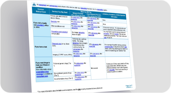Page 2 of 7 QP250021_L * For more information about limitations and exceptions, see the plan or policy document at www.phpni.com. All copayment and coinsurance costs shown in this chart are after your deductible has been met, if a deductible applies. Common Medical Event Services You May Need What You Will Pay Limitations, Exceptions, & Other Important Information Network Provider (You will pay the least) Out-of-Network Provider (You will pay the most) If you visit a health care provider’s office or clinic Primary care visit to treat an injury or illness No coinsurance after deductible 30% coinsurance after deductible None Specialist visit No coinsurance after deductible 30% coinsurance after deductible None Other practitioner visit No coinsurance after deductible 30% coinsurance after deductible Chiropractor services: 45 visits/calendar year across outpatient & other professional visits. Preventive care/screening/ immunization No charge; deductible does not apply 30% coinsurance after deductible You may have to pay for services that aren’t preventive. Ask your provider if the services needed are preventive. Then check what your plan will pay for. If you have a test Diagnostic test (x-ray, blood work) Performed at a LabCorp facility: No charge; deductible does not apply Performed at a Non- LabCorp facility: No coinsurance after deductible 30% coinsurance after deductible For coverage of specific radiology services, preauthorization is required to prevent claim denial. Urine drug screenings are limited to a total of 24 screenings per Calendar Year. Imaging (CT/PET scans, MRIs) No coinsurance after deductible 30% coinsurance after deductible If you need drugs to treat your illness or condition More information about prescription drug coverage is available at www.phpni.com Preferred generic drugs (Tier 1) No coinsurance after deductible Not covered Covers up to 30 day supply (retail) or 90 day supply (mail order). Member pays price difference between brand name & generic, plus deductible, if the brand name drug is ordered & generic is available. Non-preferred generic drugs (Tier 2) No coinsurance after deductible Brand formulary drugs (Tier 3) No coinsurance after deductible