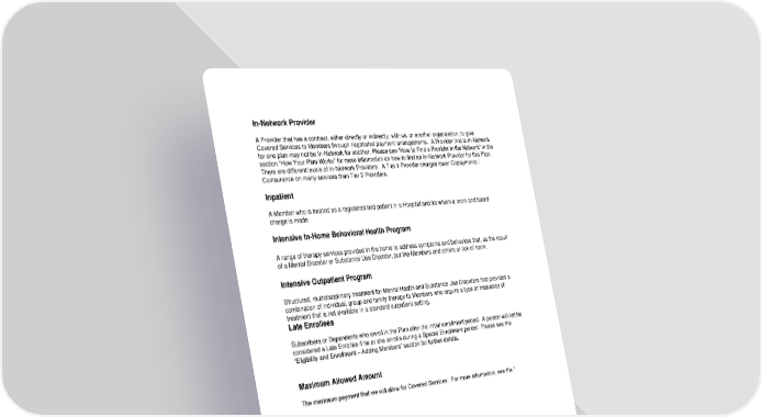 In-Network Provider A Provider that has a contract, either directly or indirectly, with us, or another organization, to give Covered Services to Members through negotiated payment arrangements. A Provider that is In-Network for one plan may not be In-Network for another. Please see “How to Find a Provider in the Network” in the section “How Your Plan Works” for more information on how to find an In-Network Provider for this Plan. There are different levels of In-Network Providers. A Tier 1 Provider charges lower Copayments / Coinsurance on many services than Tier 2 Providers. Inpatient A Member who is treated as a registered bed patient in a Hospital and for whom a room and board charge is made. Intensive In-Home Behavioral Health Program A range of therapy services provided in the home to address symptoms and behaviors that, as the result of a Mental Disorder or Substance Use Disorder, put the Members and others at risk of harm. Intensive Outpatient Program Structured, multidisciplinary treatment for Mental Health and Substance Use Disorders that provides a combination of individual, group and family therapy to Members who require a type or frequency of treatment that is not available in a standard outpatient setting. Late Enrollees Subscribers or Dependents who enroll in the Plan after the initial enrollment period. A person will not be considered a Late Enrollee if he or she enrolls during a Special Enrollment period. Please see the “Eligibility and Enrollment – Adding Members” section for further details. Maximum Allowed Amount The maximum payment that we will allow for Covered Services. For more information, see the “ 119