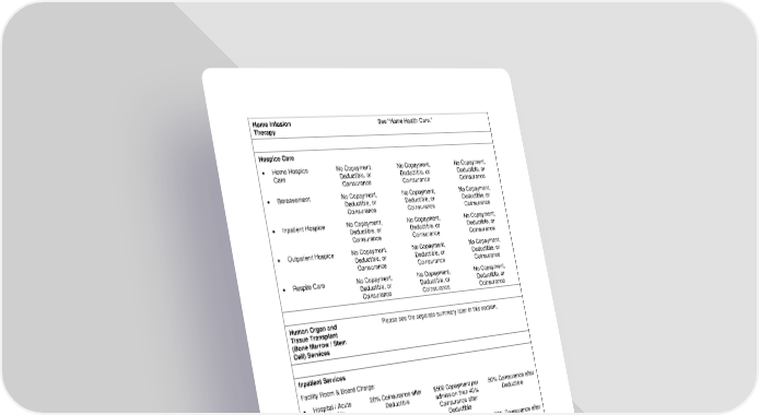 Home Infusion See “Home Health Care.” Therapy Hospice Care • Home Hospice No Copayment, No Copayment, No Copayment, Care Deductible, or Deductible, or Deductible, or Coinsurance Coinsurance Coinsurance • Bereavement No Copayment, No Copayment, No Copayment, Deductible, or Deductible, or Deductible, or Coinsurance Coinsurance Coinsurance • Inpatient Hospice No Copayment, No Copayment, No Copayment, Deductible, or Deductible, or Deductible, or Coinsurance Coinsurance Coinsurance • Outpatient Hospice No Copayment, No Copayment, No Copayment, Deductible, or Deductible, or Deductible, or Coinsurance Coinsurance Coinsurance • Respite Care No Copayment, No Copayment, No Copayment, Deductible, or Deductible, or Deductible, or Coinsurance Coinsurance Coinsurance Human Organ and Please see the separate summary later in this section. Tissue Transplant (Bone Marrow / Stem Cell) Services Inpatient Services Facility Room & Board Charge: • Hospital / Acute 20% Coinsurance after $500 Copayment per 50% Coinsurance after Care Facility Deductible admission then 40% Deductible Coinsurance after Deductible • Skilled Nursing 20% Coinsurance after $500 Copayment per 50% Coinsurance after Facility Deductible admission then 40% Deductible Coinsurance after Deductible • Rehabilitation 20% Coinsurance after $500 Copayment per 50% Coinsurance after Deductible admission then 40% Deductible Coinsurance after Deductible • Skilled Nursing 150 days per Benefit Period, In- and Out-of-Network combined Facility / Rehabilitation Services (Includes Services in an Outpatient Day 20
