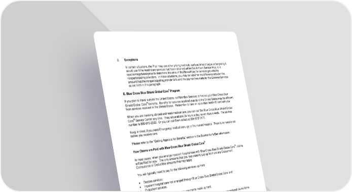2. Exceptions In certain situations, the Plan may use other pricing methods, such as billed charges or the pricing it would use if the healthcare services had been obtained within the Anthem Service Area, or a special negotiated price to determine the amount the Plan will pay for services provided by nonparticipating providers. In these situations, you may be liable for the difference between the amount that the nonparticipating provider bills and the payment we make for the Covered Services as set forth in this paragraph. E. Blue Cross Blue Shield Global Core® Program If you plan to travel outside the United States, call Member Services to find out your Blue Cross Blue Shield Global Core® benefits. Benefits for services received outside of the United States may be different from services received in the United States. Remember to take an up to date health ID card with you. When you are traveling abroad and need medical care, you can call the Blue Cross Blue Shield Global ® Core Service Center any time. They are available 24 hours a day, seven days a week. The toll free number is 800-810-2583. Or you can call them collect at 804-673-1177. Keep in mind, if you need Emergency medical care, go to the nearest hospital. There is no need to call before you receive care. Please refer to the “Getting Approval for Benefits” section in this Booklet for further information. How Claims are Paid with Blue Cross Blue Shield Global Core® In most cases, when you arrange inpatient hospital care with Blue Cross Blue Shield Global Core®, claims will be filed for you. The only amounts that you may need to pay up front are any Copayment, Coinsurance or Deductible amounts that may apply. You will typically need to pay for the following services up front: • Doctors services; • Inpatient hospital care not arranged through Blue Cross Blue Shield Global Core; and • Outpatient services. You will need to file a claim form for any payments made up front. When you need Blue Cross Blue Shield Global Core® claim forms you can get international claims forms in the following ways: • Call the Blue Cross Blue Shield Global Core® Service Center at the numbers above; or • Online at www.bcbsglobalcore.com. You will find the address for mailing the claim on the form. 81