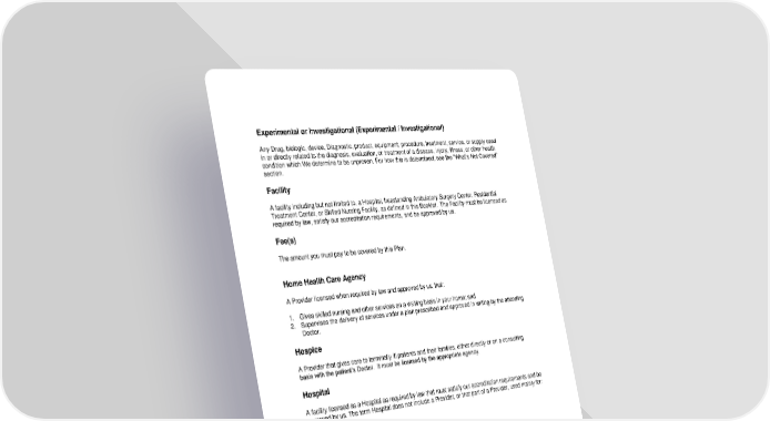 Experimental or Investigational (Experimental / Investigational) Any Drug, biologic, device, Diagnostic, product, equipment, procedure, treatment, service, or supply used in or directly related to the diagnosis, evaluation, or treatment of a disease, injury, illness, or other health condition which We determine to be unproven. For how this is determined, see the “What’s Not Covered” section. Facility A facility including but not limited to, a Hospital, freestanding Ambulatory Surgery Center, Residential Treatment Center, or Skilled Nursing Facility, as defined in this Booklet. The Facility must be licensed as required by law, satisfy our accreditation requirements, and be approved by us. Fee(s) The amount you must pay to be covered by this Plan. Home Health Care Agency A Provider licensed when required by law and approved by us, that: 1. Gives skilled nursing and other services on a visiting basis in your home; and 2. Supervises the delivery of services under a plan prescribed and approved in writing by the attending Doctor. Hospice A Provider that gives care to terminally ill patients and their families, either directly or on a consulting basis with the patient’s Doctor. It must be licensed by the appropriate agency. Hospital A facility licensed as a Hospital as required by law that must satisfy our accreditation requirements and be approved by us. The term Hospital does not include a Provider, or that part of a Provider, used mainly for: 1. Nursing care 2. Rest care 3. Convalescent care 4. Care of the aged 5. Custodial Care 6. Educational care 7. Subacute care Identification Card (ID Card) The card given to you that showing your Member identification, group numbers, and the Plan you have. 118