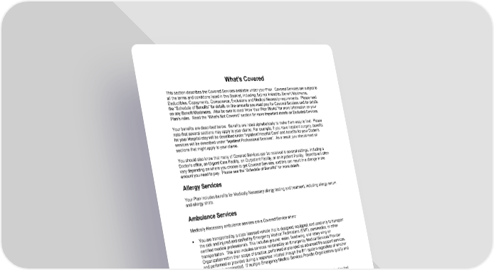 What’s Covered This section describes the Covered Services available under your Plan. Covered Services are subject to all the terms and conditions listed in this Booklet, including, but not limited to, Benefit Maximums, Deductibles, Copayments, Coinsurance, Exclusions and Medical Necessity requirements. Please read the “Schedule of Benefits” for details on the amounts you must pay for Covered Services and for details on any Benefit Maximums. Also be sure to read “How Your Plan Works” for more information on your Plan’s rules. Read the “What’s Not Covered” section for more important details on Excluded Services. Your benefits are described below. Benefits are listed alphabetically to make them easy to find. Please note that several sections may apply to your claims. For example, if you have inpatient surgery, benefits for your Hospital stay will be described under “Inpatient Hospital Care” and benefits for your Doctor’s services will be described under “Inpatient Professional Services”. As a result, you should read all sections that might apply to your claims. You should also know that many of Covered Services can be received in several settings, including a Doctor’s office, an Urgent Care Facility, an Outpatient Facility, or an Inpatient Facility. Benefits will often vary depending on where you choose to get Covered Services, and this can result in a change in the amount you need to pay. Please see the “Schedule of Benefits” for more details. Allergy Services Your Plan includes benefits for Medically Necessary allergy testing and treatment, including allergy serum and allergy shots. Ambulance Services Medically Necessary ambulance services are a Covered Service when: • You are transported by a state licensed vehicle that is designed, equipped, and used only to transport the sick and injured and staffed by Emergency Medical Technicians (EMT), paramedics, or other certified medical professionals. This includes ground, water, fixed wing, and rotary wing air transportation. This also includes services rendered by an Emergency Medical Services Provider Organization within their scope of practice, performed or provided as advanced life support services, and performed or provided during a response initiated through the 911 system regardless of whether the patient is transported. If multiple Emergency Medical Services Provider Organizations qualify and submit a claim to Us, We: - May reimburse for one (1) claim per patient encounter; and - Reimburse the claim submitted by the Emergency Medical Services Provider Organization that performed or provided the majority of advanced life support services to you. And one or more of the following are met: • For ground ambulance, you are taken: - From your home, the scene of an accident or medical Emergency to a Hospital; - Between Hospitals, including when we require you to move from an Out-of-Network Hospital to an In-Network Hospital; - Between a Hospital and a Skilled Nursing Facility or other approved Facility. • For air or water ambulance, you are taken: - From the scene of an accident or medical Emergency to a Hospital; - Between Hospitals, including when we require you to move from an Out-of-Network Hospital to an In-Network Hospital; 42
