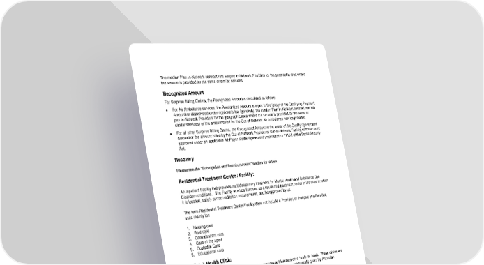 The median Plan In-Network contract rate we pay In-Network Providers for the geographic area where the service is provided for the same or similar services. Recognized Amount For Surprise Billing Claims, the Recognized Amount is calculated as follows: • For Air Ambulance services, the Recognized Amount is equal to the lesser of the Qualifying Payment Amount as determined under applicable law (generally, the median Plan In-Network contract rate we pay In-Network Providers for the geographic area where the service is provided for the same or similar services) or the amount billed by the Out-of-Network Air Ambulance service provider. • For all other Surprise Billing Claims, the Recognized Amount is the lesser of the Qualifying Payment Amount or the amount billed by the Out-of-Network Provider or Out-of-Network Facility; or the amount approved under an applicable All-Payer Model Agreement under section 1115A of the Social Security Act. Recovery Please see the “Subrogation and Reimbursement” section for details. Residential Treatment Center / Facility: An Inpatient Facility that provides multidisciplinary treatment for Mental Health and Substance Use Disorder conditions. The Facility must be licensed as a residential treatment center in the state in which it is located, satisfy our accreditation requirements, and be approved by us The term Residential Treatment Center/Facility does not include a Provider, or that part of a Provider, used mainly for: 1. Nursing care 2. Rest care 3. Convalescent care 4. Care of the aged 5. Custodial Care 6. Educational care Retail Health Clinic A Facility that gives limited basic health care services to Members on a “walk-in” basis. These clinics are often found in major pharmacies or retail stores. Medical services are typically given by Physician Assistants and Nurse Practitioners. Service Area The geographical area where you can get Covered Services from an In-Network Provider. Skilled Nursing Facility An Inpatient Facility that provides multidisciplinary treatment for convalescent and rehabilitative care. It must be licensed as a skilled nursing facility in the state in which it is located, satisfy our accreditation requirements, and be approved by us. A Skilled Nursing Facility is not a place mainly for care of the aged, Custodial Care or domiciliary care, or a place for rest, educational, or similar services. 123