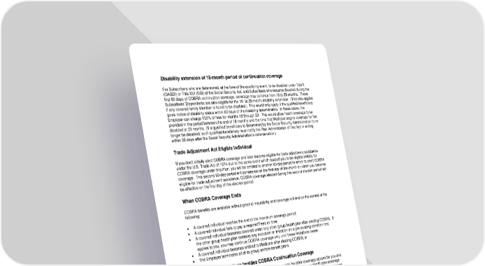 Disability extension of 18-month period of continuation coverage For Subscribers who are determined, at the time of the qualifying event, to be disabled under Title II (OASDI) or Title XVI (SSI) of the Social Security Act, and Subscribers who become disabled during the first 60 days of COBRA continuation coverage, coverage may continue from 18 to 29 months. These Subscribers’ Dependents are also eligible for the 18- to 29-month disability extension. (This also applies if any covered family Member is found to be disabled.) This would only apply if the qualified beneficiary gives notice of disability status within 60 days of the disabling determination. In these cases, the Employer can charge 150% of fees for months 19 through 29. This would allow health coverage to be provided in the period between the end of 18 months and the time that Medicare begins coverage for the disabled at 29 months. (If a qualified beneficiary is determined by the Social Security Administration to no longer be disabled, such qualified beneficiary must notify the Plan Administrator of that fact in writing within 30 days after the Social Security Administration’s determination.) Trade Adjustment Act Eligible Individual If you don’t initially elect COBRA coverage and later become eligible for trade adjustment assistance under the U.S. Trade Act of 1974 due to the same event which caused you to be eligible initially for COBRA coverage under this Plan, you will be entitled to another 60-day period in which to elect COBRA coverage. This second 60-day period will commence on the first day of the month on which you become eligible for trade adjustment assistance. COBRA coverage elected during this second election period will be effective on the first day of the election period. When COBRA Coverage Ends COBRA benefits are available without proof of insurability and coverage will end on the earliest of the following: • A covered individual reaches the end of the maximum coverage period; • A covered individual fails to pay a required Fees on time; • A covered individual becomes covered under any other group health plan after electing COBRA. If the other group health plan contains any exclusion or limitation on a pre-existing condition that applies to you, you may continue COBRA coverage only until these limitations cease; • A covered individual becomes entitled to Medicare after electing COBRA; or • The Employer terminates all of its group welfare benefit plans. Other coverage options besides COBRA Continuation Coverage Instead of enrolling in COBRA continuation coverage, there may be other coverage options for you and your family through the Health Insurance Marketplace, Medicaid, or other group health plan coverage options (such as a spouse’s plan) through what is called a “special enrollment period.” Some of these options may cost less than COBRA continuation coverage. You can learn more about many of these options at www.healthcare.gov. If You Have Questions Questions concerning your Employer's health Plan and your COBRA continuation coverage rights should be addressed to the Employer. For more information about your rights under ERISA, including COBRA, the Health Insurance Portability and Accountability Act (HIPAA), and other laws affecting group health plans, contact the nearest Regional or District Office of the U.S. Department of Labor’s Employee Benefits Security Administration (EBSA) in your area or visit the EBSA website at www.dol.gov/ebsa. (Addresses and phone numbers of Regional and District EBSA Offices are available through EBSA’s website.) 103