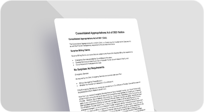 Consolidated Appropriations Act of 2021 Notice Consolidated Appropriations Act of 2021 (CAA) The Consolidated Appropriations Act of 2021 (CAA) is a Federal law that includes the No Surprises Act as well the Provider transparency requirements that are described below. Surprise Billing Claims Surprise Billing Claims are claims that are subject to the Federal No Surprises Billing Act requirements: • Emergency Services provided by Out-of-Network Providers; • Covered Services provided by an Out-of-Network Provider at an In-Network Facility; and • Out-of-Network Air Ambulance Services. No Surprises Act Requirements Emergency Services As required by the CAA, Emergency Services are covered under your Plan: • Without the need for Precertification; • Whether the Provider is In-Network or Out-of-Network; If the Emergency Services you receive are provided by an Out-of-Network Provider, Covered Services will be processed at the In-Network benefit level. Note that if you receive Emergency Services from an Out-of-Network Provider, your Out-of-Pocket costs will be limited to amounts that would apply if the Covered Services had been furnished by an In-Network Provider. However, Out-of-Network cost-shares (i.e., Copayments, Deductibles and/or Coinsurance) will apply to your claim if the treating Out-of-Network Provider determines you are stable, meaning you have been provided necessary Emergency Care such that your condition will not materially worsen and the Out-of-Network Provider determines: (i) that you are able to travel to an In-Network Facility by non- emergency transport; (ii) the Out-of-Network Provider complies with the notice and consent requirement; and (iii) you are in condition to receive the information and provide informed consent. If you continue to receive services from the Out-of-Network Provider after you are stabilized, you will be responsible for the Out-of-Network cost-shares, and the Out-of-Network Provider will also be able to charge you any difference between the Maximum Allowed Amount and the Out-of-Network Provider’s billed charges. This notice and consent exception does not apply if the Covered Services furnished by an Out-of-Network Provider result from unforeseen and urgent medical needs arising at the time of service. Out-of-Network Services Provided at an In-Network Facility When you receive Covered Services from an Out-of-Network Provider at an In-Network Facility, your Out- of-Pocket costs will be limited to amounts that would apply if the Covered Service had been furnished by an In-Network Provider. However, if the Out-of-Network Provider gives you proper notice of its charges, and you give written consent to such charges, claims will not be covered. This means you will be responsible for Out-of-Network cost-shares for those services and the Out-of-Network Provider can also charge you any difference between the Maximum Allowed Amount and the Out-of-Network Provider’s billed charges. This Notice and Consent process described below does not apply to Ancillary Services furnished by an Out-of-Network Provider at an In-Network Facility. Your Out-of-Pocket costs for claims for Covered Ancillary Services furnished by an Out-of-Network Provider at an In-Network Facility will be limited to amounts that would apply if the Covered Service had been furnished by an In-Network Provider. Ancillary Services are one of the following services: (A) Emergency Services; (B) anesthesiology; (C) 1