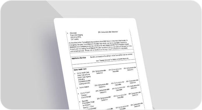 • Advanced 20% Coinsurance after Deductible Diagnostic Imaging (including MRIs, CAT scans) As described in the “Consolidated Appropriations Act of 2021 Notice” at the front of this Booklet, for Emergency Services, Out-of-Network Providers may only bill you for any applicable Copayments, Deductible and Coinsurance and may not bill you for any charges over the Plan’s Maximum Allowed Amount until the treating Out-of-Network Provider has determined you are stable and followed the notice and consent process. Please refer to the Notice at the beginning of this Booklet for more details. Habilitative Services Benefits are based on the setting in which Covered Services are received. See “Therapy Services” for details on Benefit Maximums. Home Health Care • Home Health Care 20% Coinsurance after 40% Coinsurance after 50% Coinsurance after Visits from a Home Deductible Deductible Deductible Health Care Agency (Including intermittent skilled nursing services) • Home Dialysis 20% Coinsurance after 40% Coinsurance after 50% Coinsurance after Deductible Deductible Deductible • Home Infusion 20% Coinsurance after 40% Coinsurance after 50% Coinsurance after Therapy / Deductible Deductible Deductible Chemotherapy • Specialty 20% Coinsurance after 40% Coinsurance after 50% Coinsurance after Prescription Drugs Deductible Deductible Deductible for Infusion / Injection – Other than Chemotherapy • Other Home Health 20% Coinsurance after 40% Coinsurance after 50% Coinsurance after Care Services / Deductible Deductible Deductible Supplies • Private Duty 20% Coinsurance after 40% Coinsurance after 50% Coinsurance after Nursing (Including Deductible Deductible Deductible continuous complex skilled nursing services) • Home Health Care 120 visits per Benefit Period, In- and Out-of-Network combined Benefit Maximum The limit includes Private Duty Nursing and Therapy Services (e.g., physical, speech, occupational, cardiac and pulmonary rehabilitation) given as part of the Home Care benefit. The limit does not apply to Home Infusion Therapy or Home Dialysis. 19