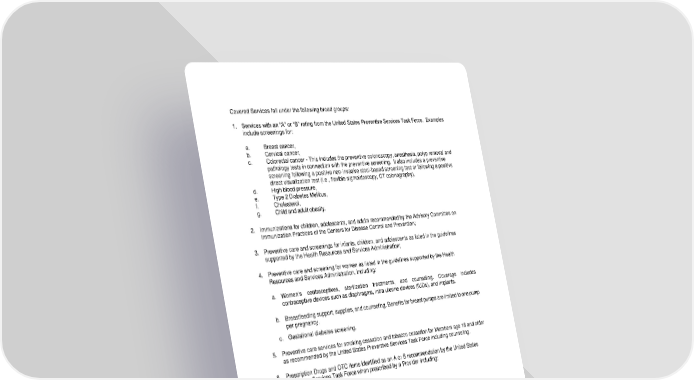 Covered Services fall under the following broad groups: 1. Services with an “A” or “B” rating from the United States Preventive Services Task Force. Examples include screenings for: a. Breast cancer, b. Cervical cancer, c. Colorectal cancer - This includes the preventive colonoscopy, anesthesia, polyp removal and pathology tests in connection with the preventive screening. It also includes a preventive screening following a positive non-invasive stool-based screening test or following a positive direct visualization test (i.e., flexible sigmoidoscopy, CT colonography), d. High blood pressure, e. Type 2 Diabetes Mellitus, f. Cholesterol, g. Child and adult obesity. 2. Immunizations for children, adolescents, and adults recommended by the Advisory Committee on Immunization Practices of the Centers for Disease Control and Prevention; 3. Preventive care and screenings for infants, children, and adolescents as listed in the guidelines supported by the Health Resources and Services Administration; 4. Preventive care and screening for women as listed in the guidelines supported by the Health Resources and Services Administration, including: a. Women’s contraceptives, sterilization treatments, and counseling. Coverage includes contraceptive devices such as diaphragms, intra uterine devices (IUDs), and implants. b. Breastfeeding support, supplies, and counseling. Benefits for breast pumps are limited to one pump per pregnancy. c. Gestational diabetes screening. 5. Preventive care services for smoking cessation and tobacco cessation for Members age 18 and older as recommended by the United States Preventive Services Task Force including counseling. 6. Prescription Drugs and OTC items identified as an A or B recommendation by the United States Preventive Services Task Force when prescribed by a Provider including: a. Aspirin b. Folic acid supplement c. Bowel preparations d. FDA-approved preexposure prophylaxis (PrEP), related services and monitoring including follow- up HIV testing and additional testing to monitor the effects of the PrEP medications. Please note that certain age and gender and quantity limitations apply. You may call Member Services at the number on your Identification Card for more details about these services or view the federal government’s websites, http://www.healthcare.gov/what-are-my-preventive- care-benefits, http://www.ahrq.gov, and http://www.cdc.gov/vaccines/recs/acip/. In addition to the Federal requirements above, preventive coverage also includes the following Covered Services: • Routine screening mammograms. 59