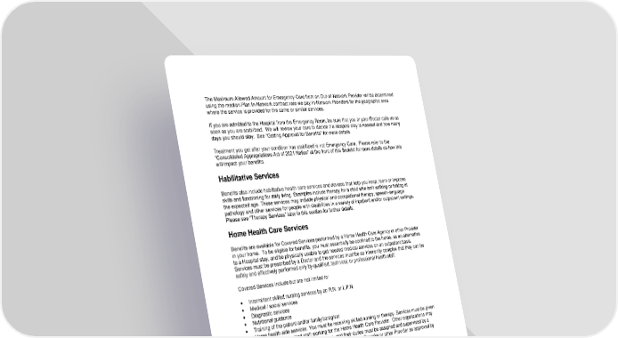 The Maximum Allowed Amount for Emergency Care from an Out-of-Network Provider will be determined using the median Plan In-Network contract rate we pay In-Network Providers for the geographic area where the service is provided for the same or similar services. If you are admitted to the Hospital from the Emergency Room, be sure that you or your Doctor calls us as soon as you are stabilized. We will review your care to decide if a Hospital stay is needed and how many days you should stay. See “Getting Approval for Benefits” for more details Treatment you get after your condition has stabilized is not Emergency Care. Please refer to the “Consolidated Appropriations Act of 2021 Notice” at the front of this Booklet for more details on how this will impact your benefits. Habilitative Services Benefits also include habilitative health care services and devices that help you keep, learn or improve skills and functioning for daily living. Examples include therapy for a child who isn’t walking or talking at the expected age. These services may include physical and occupational therapy, speech-language pathology and other services for people with disabilities in a variety of inpatient and/or outpatient settings. Please see “Therapy Services” later in this section for further details. Home Health Care Services Benefits are available for Covered Services performed by a Home Health Care Agency or other Provider in your home. To be eligible for benefits, you must essentially be confined to the home, as an alternative to a Hospital stay, and be physically unable to get needed medical services on an outpatient basis. Services must be prescribed by a Doctor and the services must be so inherently complex that they can be safely and effectively performed only by qualified, technical, or professional health staff. Covered Services include but are not limited to: • Intermittent skilled nursing services by an R.N. or L.P.N. • Medical / social services • Diagnostic services • Nutritional guidance • Training of the patient and/or family/caregiver • Home health aide services. You must be receiving skilled nursing or therapy. Services must be given by appropriately trained staff working for the Home Health Care Provider. Other organizations may give services only when approved by us, and their duties must be assigned and supervised by a professional nurse on the staff of the Home Health Care Provider or other Provider as approved by the Plan. • Therapy Services (except for Manipulation Therapy, which will not be covered when given in the home) • Medical supplies • Durable medical equipment • Private duty nursing services • When available in your area, benefits are also available for Intensive In-home Behavioral Health Services. These do not require confinement to the home. These services are described in the “Mental Health and Substance Use Disorder Services” section below. Benefits may also be available for Inpatient Services in your home. These benefits are separate from the Home Health Care Services benefit, and are described in the “Inpatient Services” section below. 51