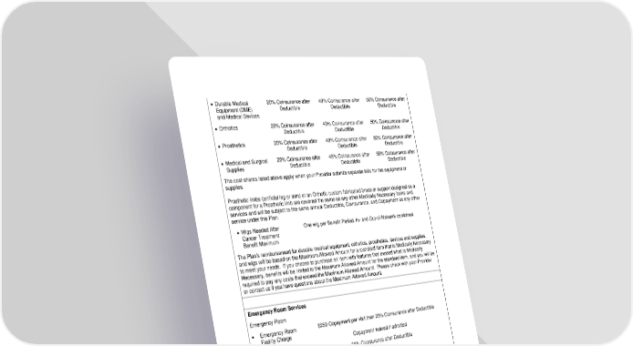 • Durable Medical 20% Coinsurance after 40% Coinsurance after 50% Coinsurance after Equipment (DME) Deductible Deductible Deductible and Medical Devices • Orthotics 20% Coinsurance after 40% Coinsurance after 50% Coinsurance after Deductible Deductible Deductible • Prosthetics 20% Coinsurance after 40% Coinsurance after 50% Coinsurance after Deductible Deductible Deductible • Medical and Surgical 20% Coinsurance after 40% Coinsurance after 50% Coinsurance after Supplies Deductible Deductible Deductible The cost-shares listed above apply when your Provider submits separate bills for the equipment or supplies. Prosthetic limbs (artificial leg or arm) or an Orthotic custom fabricated brace or support designed as a component for a Prosthetic limb are covered the same as any other Medically Necessary items and services and will be subject to the same annual Deductible, Coinsurance, and Copayment as any other service under this Plan. • Wigs Needed After One wig per Benefit Period. In- and Out-of-Network combined Cancer Treatment Benefit Maximum The Plan’s reimbursement for durable medical equipment, orthotics, prosthetics, devices and supplies, and wigs will be based on the Maximum Allowed Amount for a standard item that is Medically Necessary to meet your needs. If you choose to purchase an item with features that exceed what is Medically Necessary, benefits will be limited to the Maximum Allowed Amount for the standard item, and you will be required to pay any costs that exceed the Maximum Allowed Amount. Please check with your Provider or contact us if you have questions about the Maximum Allowed Amount. Emergency Room Services Emergency Room • Emergency Room $250 Copayment per visit then 20% Coinsurance after Deductible Facility Charge Copayment waived if admitted • Emergency Room 20% Coinsurance after Deductible Doctor Charge (ER physician, radiologist, anesthesiologist, surgeon) • Emergency Room 20% Coinsurance after Deductible Doctor Charge (Mental Health / Substance Use Disorder) • Other Facility 20% Coinsurance after Deductible Charges (including diagnostic x-ray and lab services, medical supplies) 18