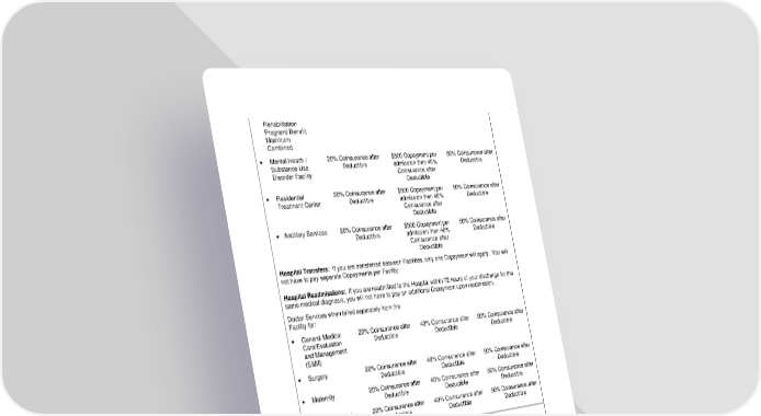Rehabilitation Program) Benefit Maximum Combined • Mental Health / 20% Coinsurance after $500 Copayment per 50% Coinsurance after Substance Use Deductible admission then 40% Deductible Disorder Facility Coinsurance after Deductible • Residential 20% Coinsurance after $500 Copayment per 50% Coinsurance after Treatment Center Deductible admission then 40% Deductible Coinsurance after Deductible • Ancillary Services 20% Coinsurance after $500 Copayment per 50% Coinsurance after Deductible admission then 40% Deductible Coinsurance after Deductible Hospital Transfers: If you are transferred between Facilities, only one Copayment will apply. You will not have to pay separate Copayments per Facility. Hospital Readmissions: If you are readmitted to the Hospital within 72 hours of your discharge for the same medical diagnosis, you will not have to pay an additional Copayment upon readmission. Doctor Services when billed separately from the Facility for: • General Medical 20% Coinsurance after 40% Coinsurance after 50% Coinsurance after Care/Evaluation Deductible Deductible Deductible and Management (E&M) • Surgery 20% Coinsurance after 40% Coinsurance after 50% Coinsurance after Deductible Deductible Deductible • Maternity 20% Coinsurance after 40% Coinsurance after 50% Coinsurance after Deductible Deductible Deductible • Mental Health / 20% Coinsurance after 40% Coinsurance after 50% Coinsurance after Substance Use Deductible Deductible Deductible Disorder Services Maternity and Reproductive Health Services • Maternity Visits 20% Coinsurance after 40% Coinsurance after 50% Coinsurance after (Global fee for the Deductible Deductible Deductible ObGyn’s prenatal, postnatal, and The Office Visit delivery services) Copayment will also apply to the first prenatal visit. • Inpatient Facility See “Inpatient Services” Services (Delivery) 21