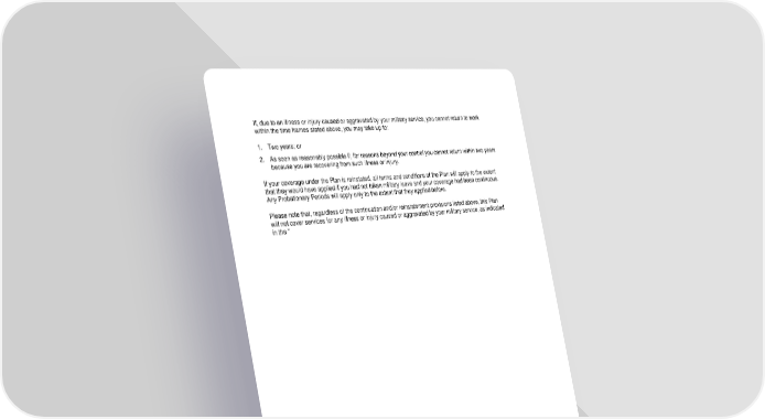 If, due to an illness or injury caused or aggravated by your military service, you cannot return to work within the time frames stated above, you may take up to: 1. Two years; or 2. As soon as reasonably possible if, for reasons beyond your control you cannot return within two years because you are recovering from such illness or injury. If your coverage under the Plan is reinstated, all terms and conditions of the Plan will apply to the extent that they would have applied if you had not taken military leave and your coverage had been continuous. Any Probationary Periods will apply only to the extent that they applied before. Please note that, regardless of the continuation and/or reinstatement provisions listed above, this Plan will not cover services for any illness or injury caused or aggravated by your military service, as indicated in the " 105