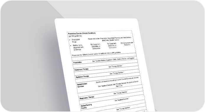 Preventive Care for Chronic Conditions (per IRS guidelines) • Prescription Please refer to the “Prescription Drug Retail Pharmacy and Home Delivery Drugs (Mail Order) Benefits” section. • Medical items, No Copayment, No Copayment, 50% Coinsurance after equipment and Deductible, or Deductible, or Deductible screenings Coinsurance Coinsurance Please see the “What’s Covered” section for additional detail on IRS guidelines. Prosthetics See “Durable Medical Equipment (DME), Medical Devices, and Supplies.” Pulmonary Therapy See “Therapy Services.” Radiation Therapy See “Therapy Services.” Rehabilitation Benefits are based on the setting in which Covered Services are received. Services See “Inpatient Services” and “Therapy Services” for details on Benefit Maximums. Respiratory Therapy See “Therapy Services.” Skilled Nursing See “Inpatient Services.” Facility Speech Therapy See “Therapy Services.” Surgery Benefits are based on the setting in which Covered Services are received. Temporomandibular Benefits are based on the setting in which Covered Services are received. and Craniomandibular Joint Treatment Therapy Services Benefits are based on the setting in which Covered Services are received. Benefit Maximum(s): Benefit Maximum(s) are for In- and Out-of-Network visits combined, and for office and outpatient visits combined. 27