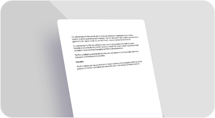 You acknowledge the Plan has the right to conduct an investigation regarding the injury, illness or condition to identify potential sources of recovery. The Plan reserves the right to notify all parties and their agents of its lien. Agents include, but are not limited to, insurance companies and attorneys. You acknowledge the Plan has notified you that it has the right pursuant to the Health Insurance Portability & Accountability Act (“HIPAA”), 42 U.S.C. Section 1301 et seq, to share Your personal health information in exercising these Subrogation and Reimbursement provisions. The Plan is entitled to recover its attorney’s fees and costs incurred in enforcing its rights under these Subrogation and Reimbursement provisions. Discretion The Plan Administrator has sole discretion to interpret the terms of the Subrogation and Reimbursement provisions of this Plan in its entirety and reserves the right to make changes as it deems necessary. 90