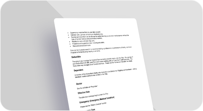 • Supervising medicine that you can take yourself, • Catheter care, general colostomy or ileostomy care, • Routine services which we decide can be safely done by you or a non-medical person without the help of trained medical and paramedical workers, • Residential care and adult day care, • Protective and supportive care, including education, • Rest and convalescent care. Care can be Custodial even if it is recommended by a professional or performed in a Facility, such as a Hospital or Skilled Nursing Facility, or at home. Deductible The amount you must pay for Covered Services before benefits begin under this Plan. For example, if your Deductible is $1,000, your Plan won’t cover anything until you meet the $1,000 Deductible. The Deductible may not apply to all Covered Services. Please see the “Schedule of Benefits” for details. Dependent A member of the Subscriber’s family who meets the rules listed in the “Eligibility and Enrollment – Adding Members” section and who has enrolled in the Plan. Doctor See the definition of “Physician.” Effective Date The date your coverage begins under this Plan. Emergency (Emergency Medical Condition) Please see the "What’s Covered" section. Emergency Care Please see the "What’s Covered" section. Employee A person who is engaged in active employment with the Employer and is eligible for Plan coverage under the employment rules of the Employer. The Employee is also called the Subscriber. Employer An Employer who has allowed its Employees to participate in the Plan by acting as the Plan Sponsor or adopting the Plan as a participating Employer by executing a formal document that so provides. The Employer or other organization has an Administrative Services Agreement with the Claims Administrator to administer this Plan. Excluded Services (Exclusion) Health care services your Plan doesn’t cover. 117