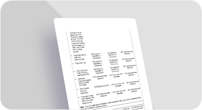 injection(s) will be applied when the injection(s) is billed by itself. The PCP or SCP office visit Copayment/Coinsur ance will apply if an office visit is billed with an allergy injection. • Diagnostic Lab (i.e., No Copayment, No Copayment, 50% Coinsurance after other than Deductible, or Deductible, or Deductible reference labs) Coinsurance Coinsurance • Diagnostic x-ray No Copayment, No Copayment, 50% Coinsurance after Deductible, or Deductible, or Deductible Coinsurance Coinsurance • Other Diagnostic No Copayment, No Copayment, 50% Coinsurance after Tests (including Deductible, or Deductible, or Deductible hearing and EKG) Coinsurance Coinsurance • Advanced 20% Coinsurance after 40% Coinsurance after 50% Coinsurance after Diagnostic Imaging Deductible Deductible Deductible (including MRIs, CAT scans) • Office Surgery $75 Copayment per visit 40% Coinsurance after 50% Coinsurance after (including Deductible Deductible anesthesia) • Prescription Drugs 20% Coinsurance after 40% Coinsurance after 50% Coinsurance after Administered in the Deductible Deductible Deductible Office (other than allergy serum) Note: If you get urgent care at a Hospital or other outpatient Facility, please refer to “Outpatient Facility Services” for details on what you will pay. Virtual Visits (from Virtual Care-Only Providers through our mobile app Out-of-Network Virtual Virtual Care Only and website: Care-Only Providers: Providers) • Virtual Visits $0 Copayment per visit Please refer to the including Primary “Office and Home Care from Virtual Visits” section. Care-Only Providers (Medical Services) • Virtual Visits from $0 Copayment per visit Please refer to the Virtual Care-Only “Office and Home Providers (Mental Visits” section. Health and 29