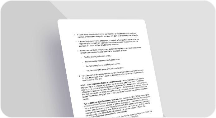 • If a court decree states that both parents are responsible for the Dependent child's health care expenses or health care coverage, the provisions of 1. above will determine the order of benefits; • If a court decree states that the parents have joint custody without specifying that one parent has responsibility for the health care expenses or health care coverage of the Dependent child, the provisions of 1. above will determine the order of benefits; or • If there is no court decree assigning responsibility for the Dependent child's health care expenses or health care coverage, the order of benefits for the child are as follows: - The Plan covering the Custodial parent; - The Plan covering the spouse of the Custodial parent; - The Plan covering the non-custodial parent; and then - The Plan covering the spouse of the non-custodial parent. 3. For a Dependent child covered under more than one Plan of individuals who are not the parents of the child, the provisions of item 1. above will determine the order of benefits as if those individuals were the parents of the child. Rule 3 - Active Employee or Retired or Laid-off Employee. The Plan that covers you as an active employee, that is, an employee who is neither laid off nor retired, is the Primary Plan. The Plan also covering you as a retired or laid-off employee is the Secondary Plan. The same would hold true if you are a Dependent of an active employee and you are a Dependent of a retired or laid-off employee. If the other Plan does not have this rule, and as a result, the Plans do not agree on the order of benefits, this rule is ignored. This rule does not apply if “Rule 1 - Non-Dependent or Dependent” can determine the order of benefits. Rule 4 - COBRA or State Continuation Coverage. If you are covered under COBRA or under a right of continuation provided by state or other federal law and are covered under another Plan, the Plan covering you as an employee, member, subscriber or retiree or covering you as a Dependent of an employee, member, subscriber or retiree is the Primary Plan and the COBRA or state or other federal continuation coverage is the Secondary Plan. If the other Plan does not have this rule, and as a result, the Plans do not agree on the order of benefits, this rule is ignored. This rule does not apply if “Rule 1 - Non- Dependent or Dependent” can determine the order of benefits. Rule 5 - Longer or Shorter Length of Coverage. The Plan that covered you longer is the Primary Plan and the Plan that covered you the shorter period of time is the Secondary Plan. Rule 6. If the preceding rules do not determine the order of benefits, the Allowable expenses will be shared equally between the Plans meeting the definition of Plan. In addition, This Plan will not pay more than it would have paid had it been the Primary Plan. EFFECT ON THE BENEFITS OF THIS PLAN When This Plan is secondary, it may reduce its benefits so that the total benefits paid or provided by all Plans during a plan year are not more than the total Allowable expenses. In determining the amount to be paid for any claim, the Secondary Plan will calculate the benefits it would have paid in the absence of other health care coverage and apply that calculated amount to any Allowable expense under its Plan that is unpaid by the Primary Plan. The Secondary Plan may then reduce its payment by the amount so that, when combined with the amount paid by the Primary Plan, the total benefits paid or provided by all Plans for the claim do not exceed the total Allowable expense for that claim. Because the Allowable expense is generally the higher of the Primary and Secondary Plans’ allowable 85