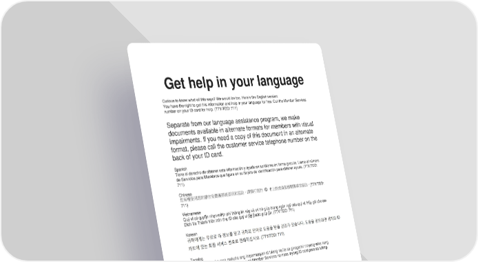 Get help in your language Curious to know what all this says? We would be too. Here’s the English version: You have the right to get this information and help in your language for free. Call the Member Services number on your ID card for help. (TTY/TDD: 711) Separate from our language assistance program, we make documents available in alternate formats for members with visual impairments. If you need a copy of this document in an alternate format, please call the customer service telephone number on the back of your ID card. Spanish Tiene el derecho de obtener esta información y ayuda en su idioma en forma gratuita. Llame al número de Servicios para Miembros que figura en su tarjeta de identificación para obtener ayuda. (TTY/TDD: 711) Chinese (TTY/TDD: 711) Vietnamese Quý vӏ có quyӅn nhұn miӉn phí thông tin này và sӵ trӧ giúp bҵng ngôn ngӳ cӫa quý vӏ. Hãy gӑi cho sӕ Dӏch Vө Thành Viên trên thҿ ID cӫa quý vӏ ÿӇ ÿѭӧc giúp ÿӥ. (TTY/TDD: 711) Korean Tagalog May karapatan kayong makuha ang impormasyon at tulong na ito sa ginagamit ninyong wika nang walang bayad. Tumawag sa numero ng Member Services na nasa inyong ID card para sa tulong. (TTY/TDD: 711) Russian Arabic Armenian 05178WPMENMUB 06/16 General #AG-GEN-001#
