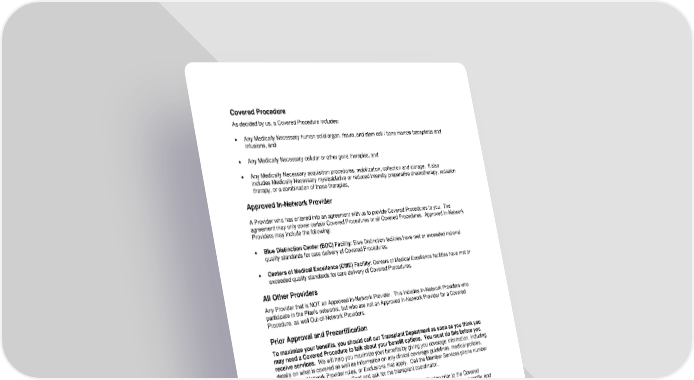 Covered Procedure As decided by us, a Covered Procedure includes: • Any Medically Necessary human solid organ, tissue, and stem cell / bone marrow transplants and infusions, and • Any Medically Necessary cellular or other gene therapies, and • Any Medically Necessary acquisition procedures, mobilization, collection and storage. It also includes Medically Necessary myeloablative or reduced intensity preparative chemotherapy, radiation therapy, or a combination of these therapies, Approved In-Network Provider A Provider who has entered into an agreement with us to provide Covered Procedures to you. The agreement may only cover certain Covered Procedures or all Covered Procedures. Approved In-Network Providers may include the following: • Blue Distinction Center (BDC) Facility: Blue Distinction facilities have met or exceeded national quality standards for care delivery of Covered Procedures. • Centers of Medical Excellence (CME) Facility: Centers of Medical Excellence facilities have met or exceeded quality standards for care delivery of Covered Procedures. All Other Providers Any Provider that is NOT an Approved In-Network Provider. This includes In-Network Providers who participate in the Plan’s networks, but who are not an Approved In-Network Provider for a Covered Procedure, as well Out-of-Network Providers. Prior Approval and Precertification To maximize your benefits, you should call our Transplant Department as soon as you think you may need a Covered Procedure to talk about your benefit options. You must do this before you receive services. We will help you maximize your benefits by giving you coverage information, including details on what is covered as well as information on any clinical coverage guidelines, medical policies, Approved In-Network Provider rules, or Exclusions that apply. Call the Member Services phone number on the back of your Identification Card and ask for the transplant coordinator. You or your Provider must call our Transplant Department for Precertification prior to the Covered Procedure whether this is performed in an Inpatient or Outpatient setting. Your Doctor must certify, and we must agree, that the Covered Procedure is Medically Necessary. Your Doctor should send a written request for Precertification to us as soon as possible to start this process. Not getting Precertification will result in a denial of benefits. Please note that there are cases where your Provider asks for approval for Human Leukocyte Antigen (HLA) testing, donor searches and/or a collection and storage of stem cells prior to the final decision as to what Covered Procedure will be needed. In these cases, the HLA testing and donor search charges will be covered as routine diagnostic tests. The collection and storage request will be reviewed for Medical Necessity and may be approved. However, such an approval for HLA testing, donor search and/or collection and storage is NOT an approval for the later Covered Procedure. A separate Medical Necessity decision will be needed for the Covered Procedure. 53