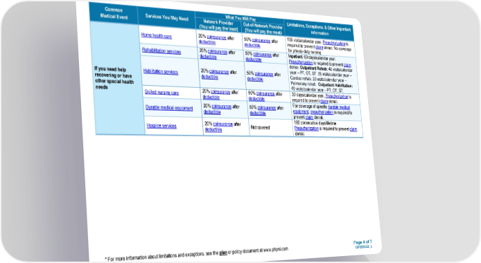 Page 4 of 7 QP250022_L * For more information about limitations and exceptions, see the plan or policy document at www.phpni.com. Common Medical Event Services You May Need What You Will Pay Limitations, Exceptions, & Other Important Information Network Provider (You will pay the least) Out-of-Network Provider (You will pay the most) If you need help recovering or have other special health needs Home health care 20% coinsurance after deductible 50% coinsurance after deductible 100 visits/calendar year. Preauthorization is required to prevent claim denial. No coverage for private-duty nursing. Rehabilitation services 20% coinsurance after deductible 50% coinsurance after deductible Inpatient: 60 days/calendar year. Preauthorization is required to prevent claim denial. Outpatient Rehab: 40 visits/calendar year – PT, OT, ST. 36 visits/calendar year – Cardiac rehab. 20 visits/calendar year – Pulmonary rehab. Outpatient Habilitation: 40 visits/calendar year – PT, OT, ST. Habilitation services 20% coinsurance after deductible 50% coinsurance after deductible Skilled nursing care 20% coinsurance after deductible 50% coinsurance after deductible 30 days/calendar year. Preauthorization is required to prevent claim denial. Durable medical equipment 20% coinsurance after deductible 50% coinsurance after deductible For coverage of specific durable medical equipment, preauthorization is required to prevent claim denial. Hospice services 20% coinsurance after deductible Not covered 180 consecutive days/lifetime. Preauthorization is required to prevent claim denial.