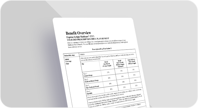 Benefit Overview ® Express Scripts Medicare (PDP) YOUR 2025 PRESCRIPTION DRUG PLAN BENEFIT Here is a summary of what you will pay for covered prescription drugs across the different stages of your Medicare Part D benefit. You can fill your covered prescriptions at a network retail pharmacy or through our home delivery service. Prescription Drug Plan Option 2: Deductible stage $100.00 Initial After you pay your yearly deductible: You will pay the following until your total yearly drug costs (what Coverage you and the plan pay) reach $2,000: stage Tier Retail Retail Home Delivery One-Month Three-Month Three-Month (31-day) Supply (90-day) Supply (90-day) Supply (Standard) Tier 1: 15% 15% 10% Generic Drugs Tier 2: 30% 30% 25% Preferred Brand Drugs Tier 3: 50% 50% 50% Non- Preferred Brand Tier 4: 25% 25% 25% Specialty If your doctor prescribes less than a full month’s supply of certain drugs, you will pay a daily cost-sharing rate based on the actual number of days of the drug that you receive. You may receive up to a 90-day supply of certain maintenance drugs (medications taken on a long-term basis) by mail through the Express Scripts PharmacySM. There is no charge for standard shipping. Not all drugs are available at a 90-day supply, and not all retail pharmacies offer a 90-day supply. Non-part D Drugs Covered; Excluding lifestyle Compound Compound Management Solution applies. Compound Management Solution is in place to mitigate compound drug abuse by means of inclusion and exclusion lists Catastrophic After your yearly out-of-pocket drug costs reach $2,000, you will pay $0 Coverage stage